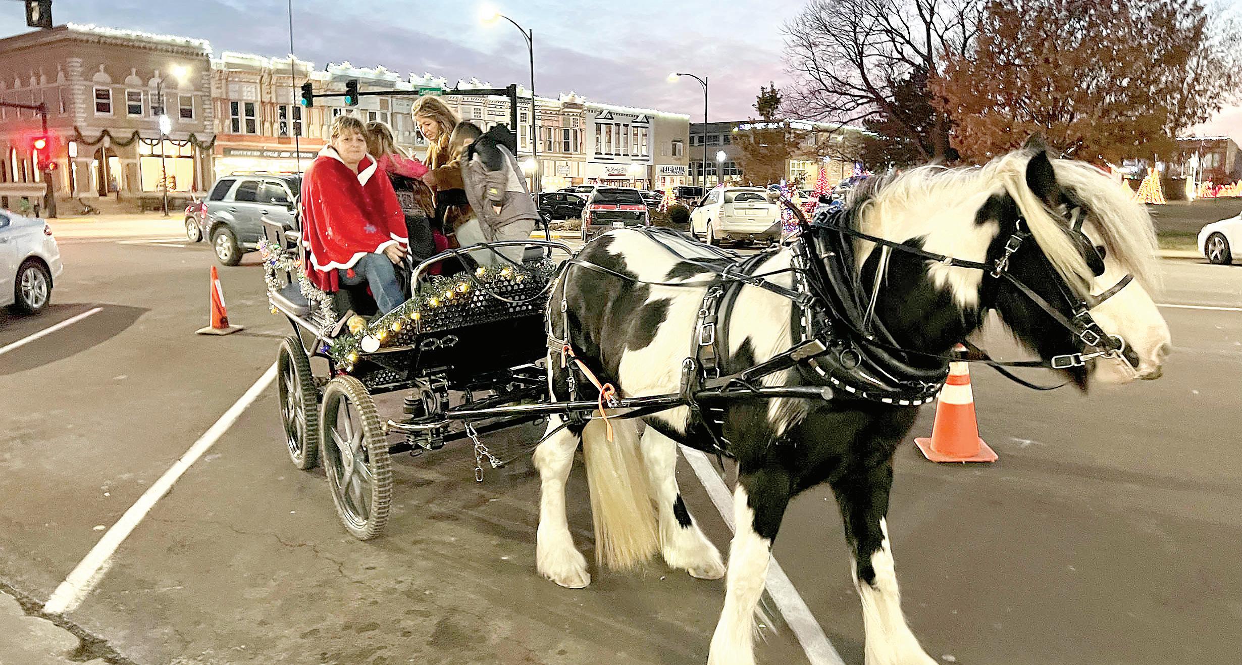 Becky Sander pilots a horse-drawn carriage during Friday’s Downtown Block Party. Businesses stayed open late to offer holiday shopping deals. REGISTER/RICHARD LUKEN