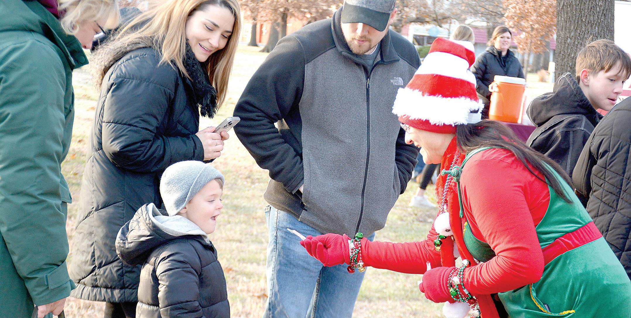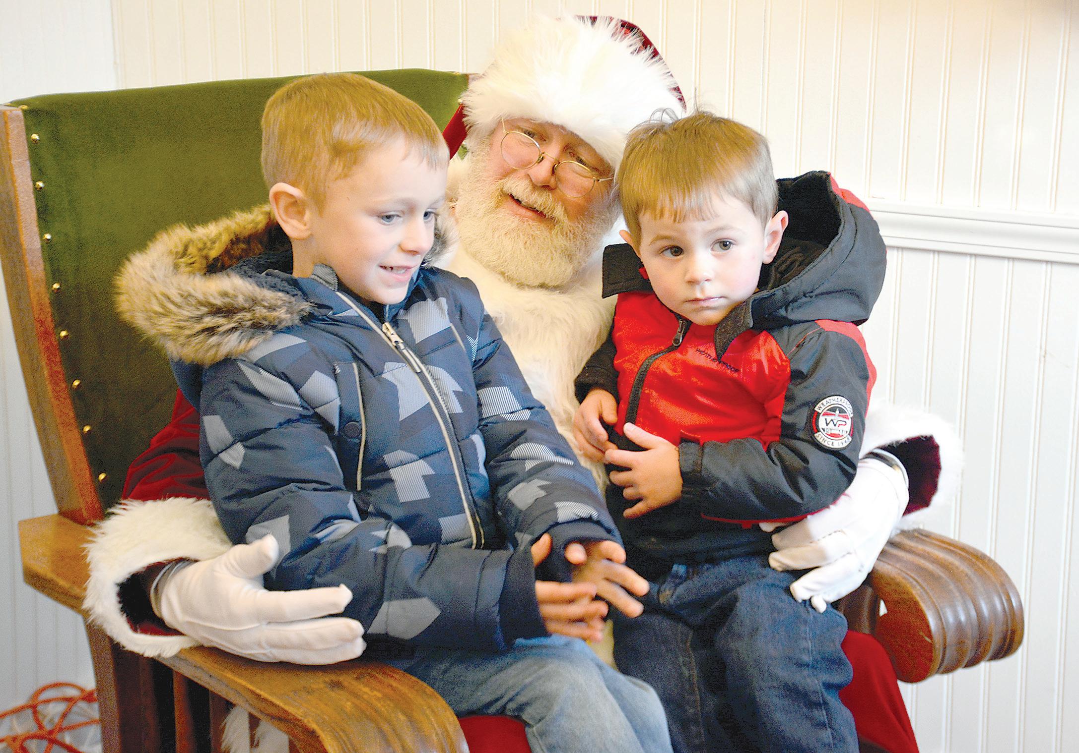 Santa will return from 5 to 7 p.m. on both Tuesday and Thursday, and from 10 a.m. to noon Saturday. At left, Kason, left, and little brother Kyle Doughty of Moran were first to visit with Santa and share their wish list. Kyle was a bit unsure about the whole thing. Below left, Liam Boltwood, with parents Katie Riffel and Kyle Boltwood, accept a candy cane from elf Sandy Hardwick. Below, Santa waves hello to the crowd upon his arrival.