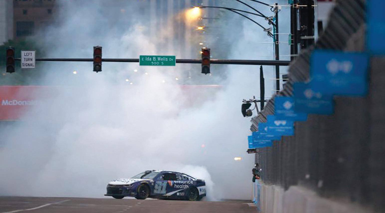 Shane van Gisbergen, driver of the No. 91 Enhance Health Chevrolet, celebrates with a burnout after winning the Cup Series Grant Park 220 at the Chicago Street Course Sunday. (Jared C. Tilton/Getty Images)