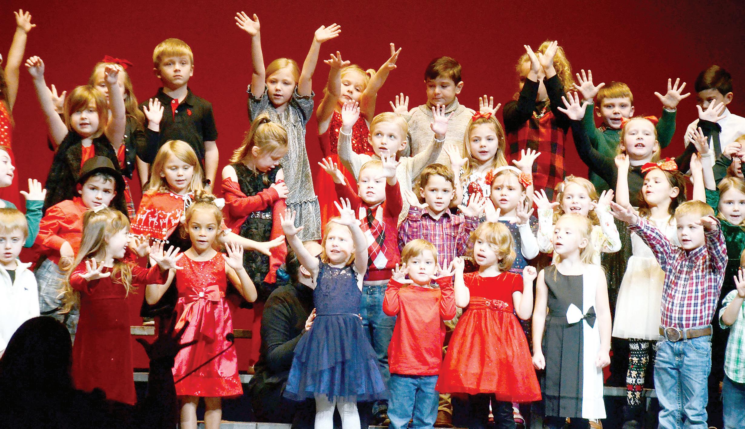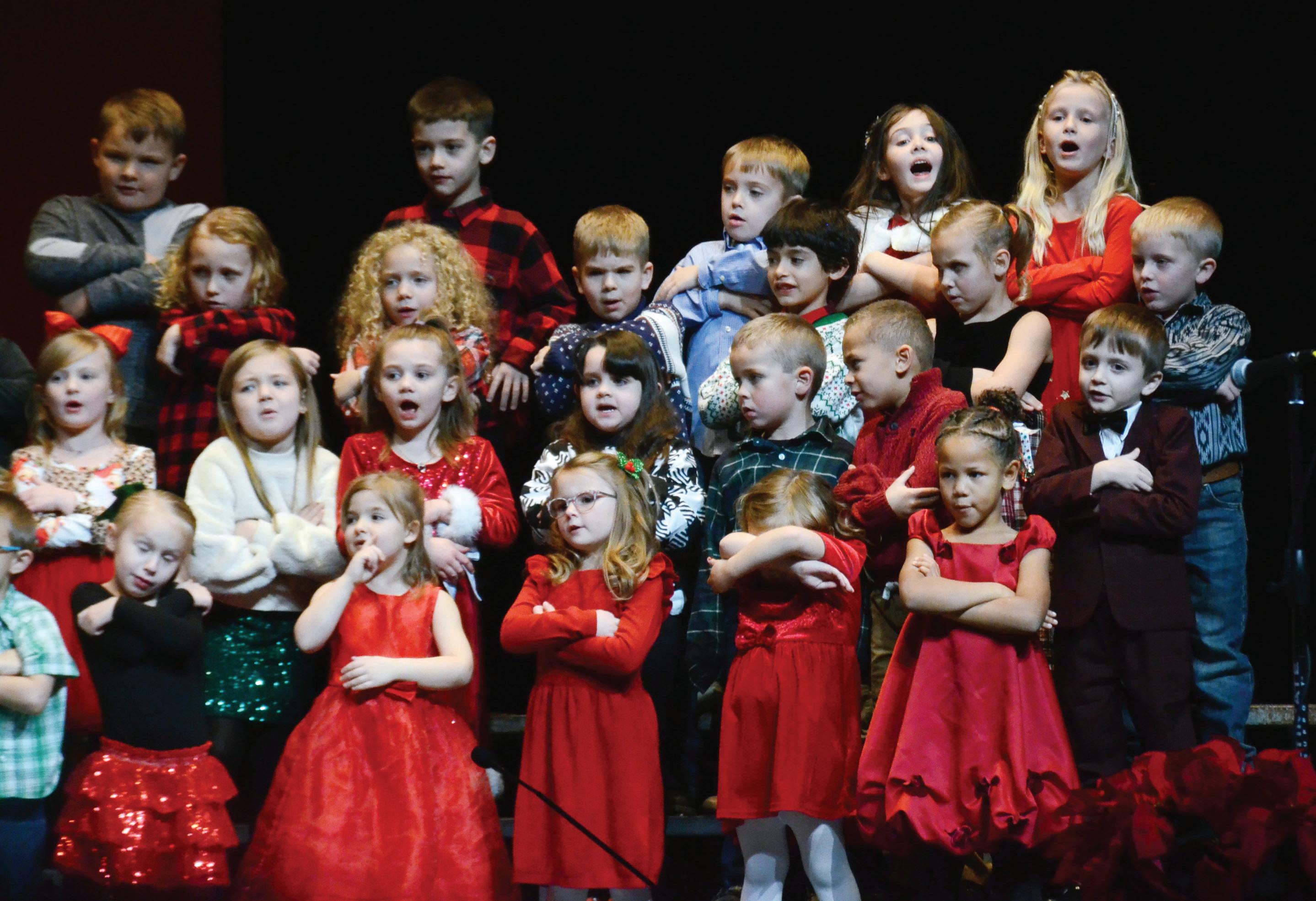 A rollicking good time filled the Bowlus Fine Arts Center on Tuesday evening as Iola Elementary School’s kindergarten and firstgrade classes presented their winter program under the direction of music instructor Kate Vernon. Here, kindergarteners sing “Jingle Bell Rock.” REGISTER/RICHARD LUKEN