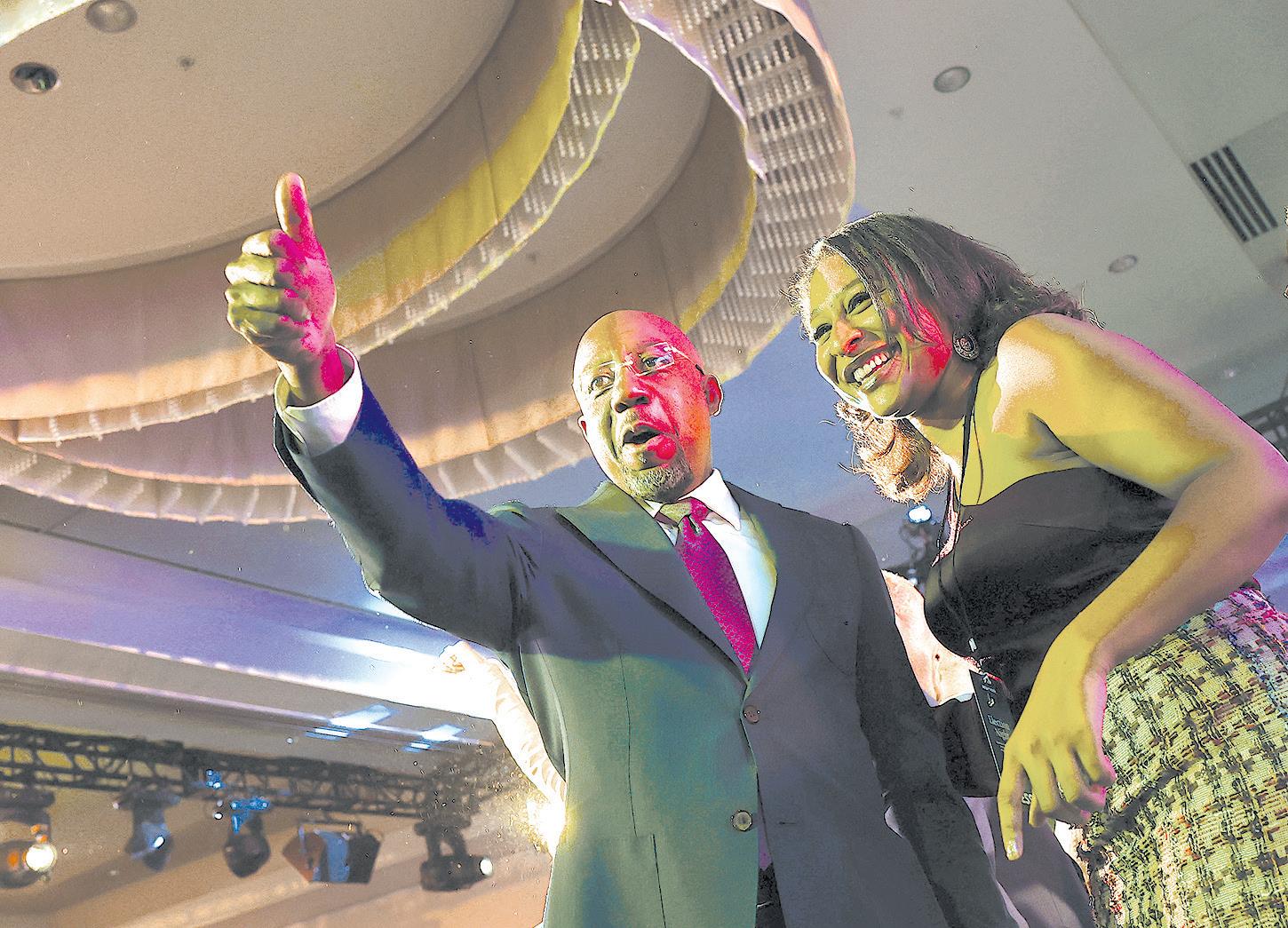 Georgia Democratic Senate candidate U.S. Sen. Raphael Warnock (D-Georgia) celebrates his election runoff win. (WIN MCNAMEE/GETTY IMAGES/TNS)