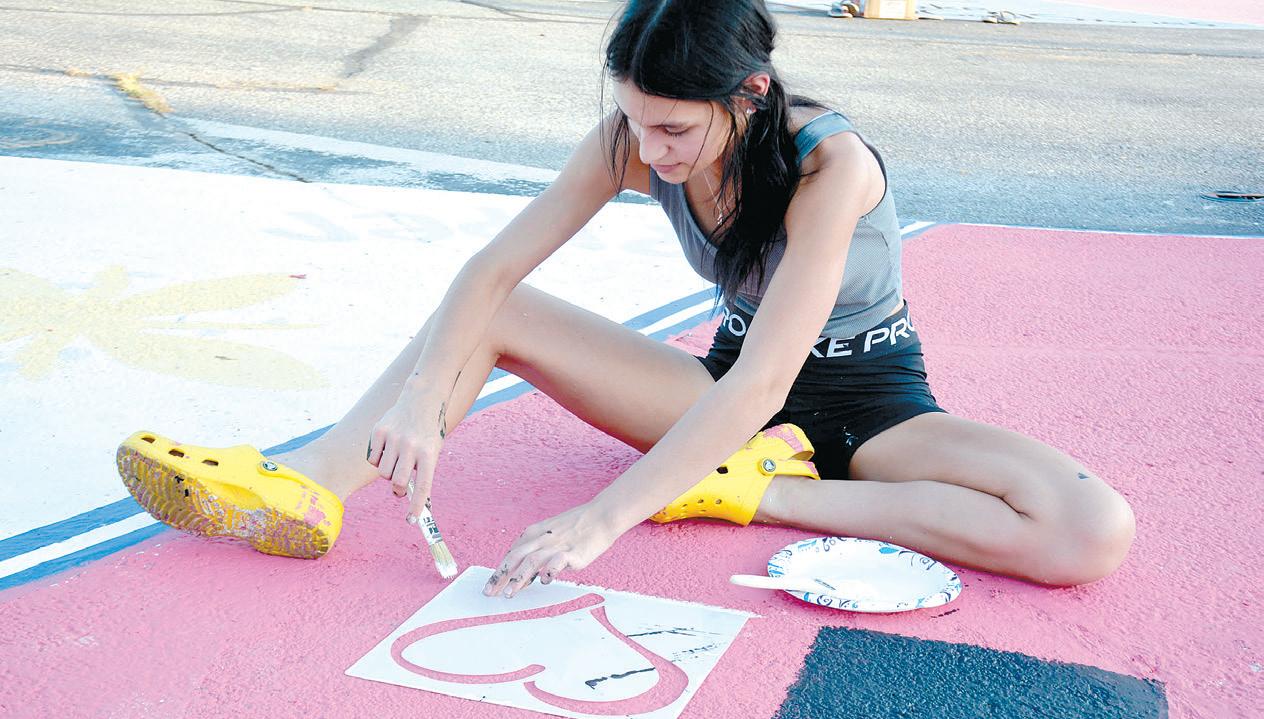 Iola High School seniors paint their parking spaces in the senior lot on Tuesday evening in preparation for the start of the school year next week. Each chose their own design to match their interests or personalities. Above, Kary Bruner uses templates to create artwork that will look like a Spotify page. Top right, Jeremy Adair, left, and Will Talkington paint the base for a scene with Doodlebob, a character in the Spongebob universe.