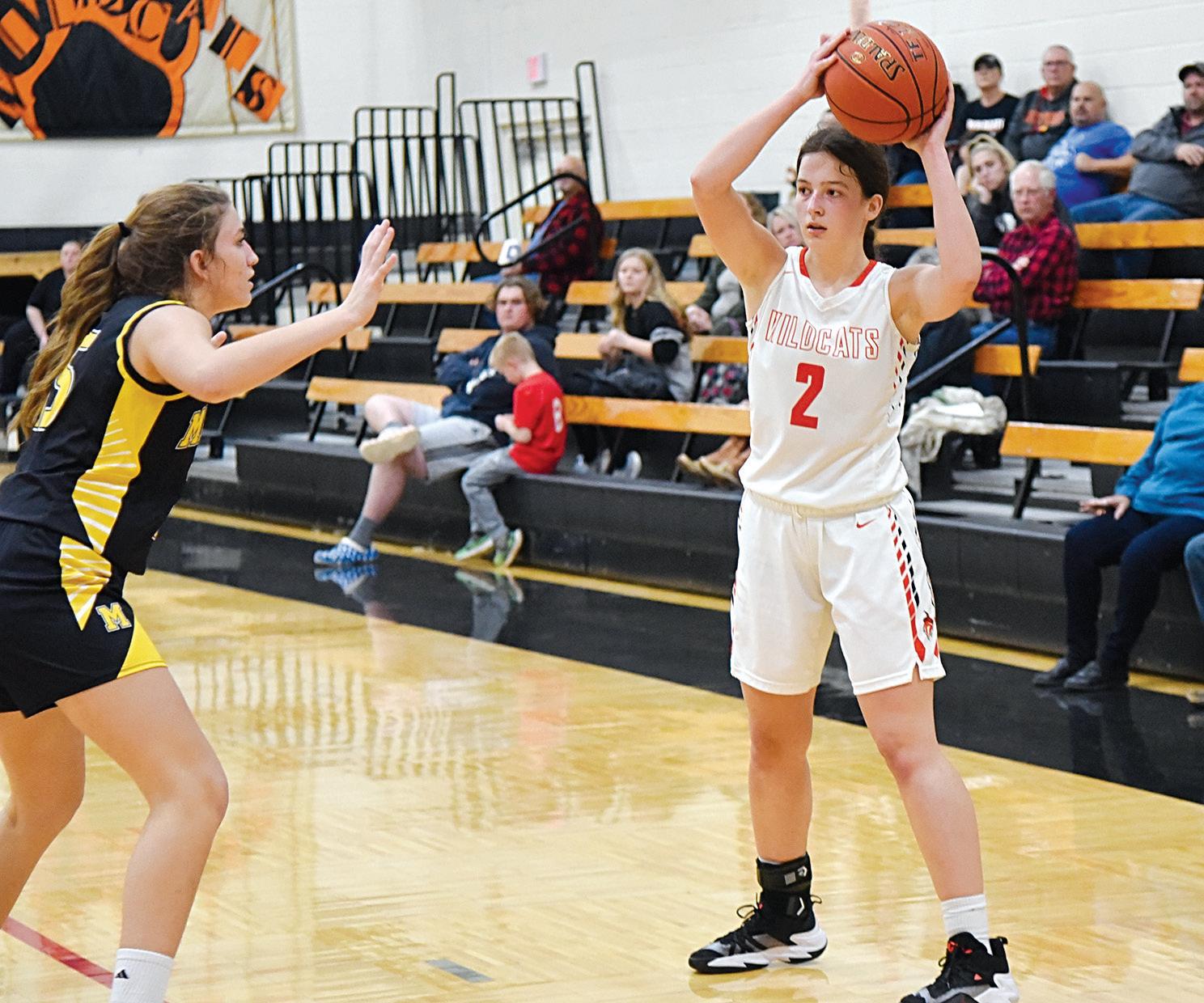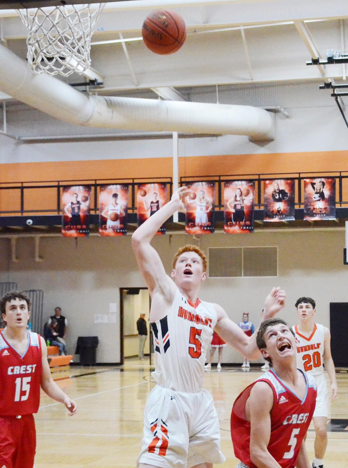 Crest High’s Kinley Edgerton (24) and Humboldt’s McKenna Jones (1) jostle for position Thursday during a free throw attempt. REGISTER/RICHARD LUKEN