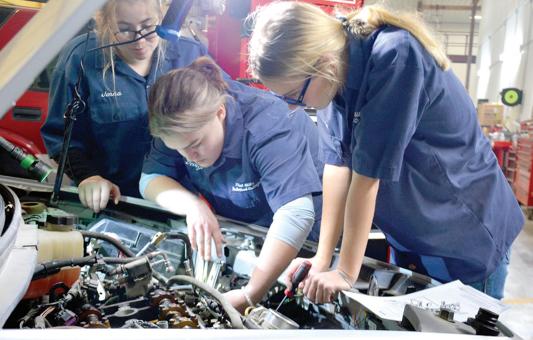 Three teenage girls twist wrenches and peer inside the engine of a Chevrolet Malibu on a Friday afternoon at the Regional Rural Technical Center at LaHarpe.