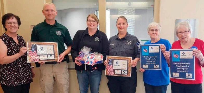 Hope Unlimited and AmeriCorps Senior volunteers partnered Monday to honor local First Responders for 9/11 Day of Remembrance. Above, from left, volunteer coordinator Lori Echavez, AmeriCorp volunteer Betty Stich, firefighters Casey Weast, Zachary Wilper, EMS director Michael Burnett, Brogan Nicholas and Sage Shaughnessy, and AmeriCorps volunteer Carol George. Middle, AmeriCorps volunteers Betty Stich, from left, Carol George, Bob Droessler of the Iola Police Department and Hope Unlimited volunteer coordinator Lori Echavez. Bottom, Sandy Haggard, NCCC AmeriCorps Seniors RSVP Director, left, along with Patrick Cash, Haley Donovan and Lisa Sears with the Allen County Sheriff’s Department and AmeriCorps volunteers Carol George and Betty Stich. COURTESY