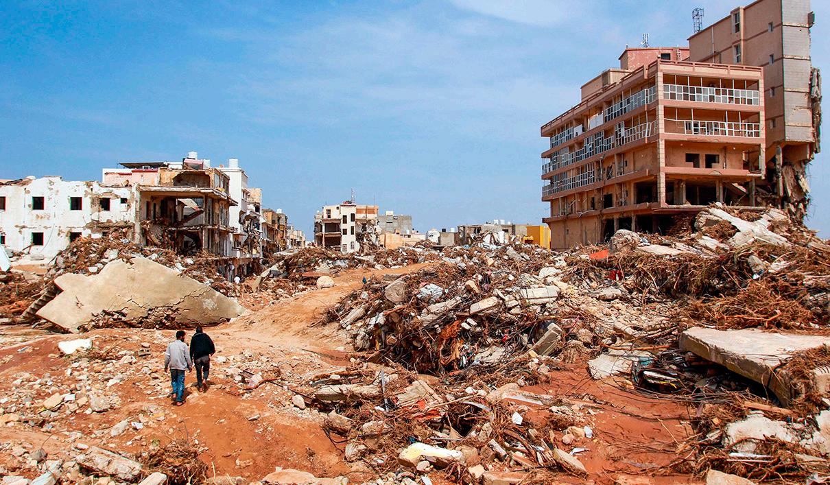 Men walk past debris of buildings caused by flash floods in Derna, eastern Libya, on Sept. 11, 2023. Flash floods in eastern Libya killed more than 2,300 people in the Mediterranean coastal city of Derna alone, the emergency services of the Tripoli-based government said on September 12. (AFP VIA GETTY IMAGES/TNS)