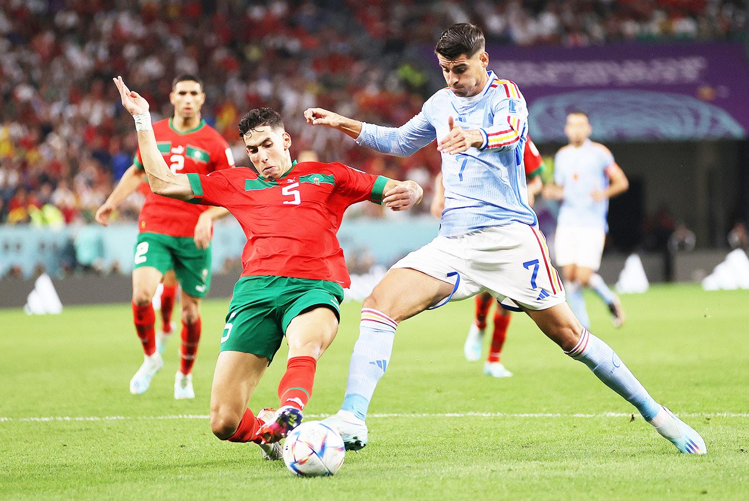 Nayef Aguerd of Morocco battles for possession with Alvaro Morata of Spain during the FIFA World Cup Qatar 2022 Round of 16 matches between Morocco and Spain on December 06 in Al Rayyan, Qatar. CLIVE BRUNSKILL/GETTY IMAGES/TNS