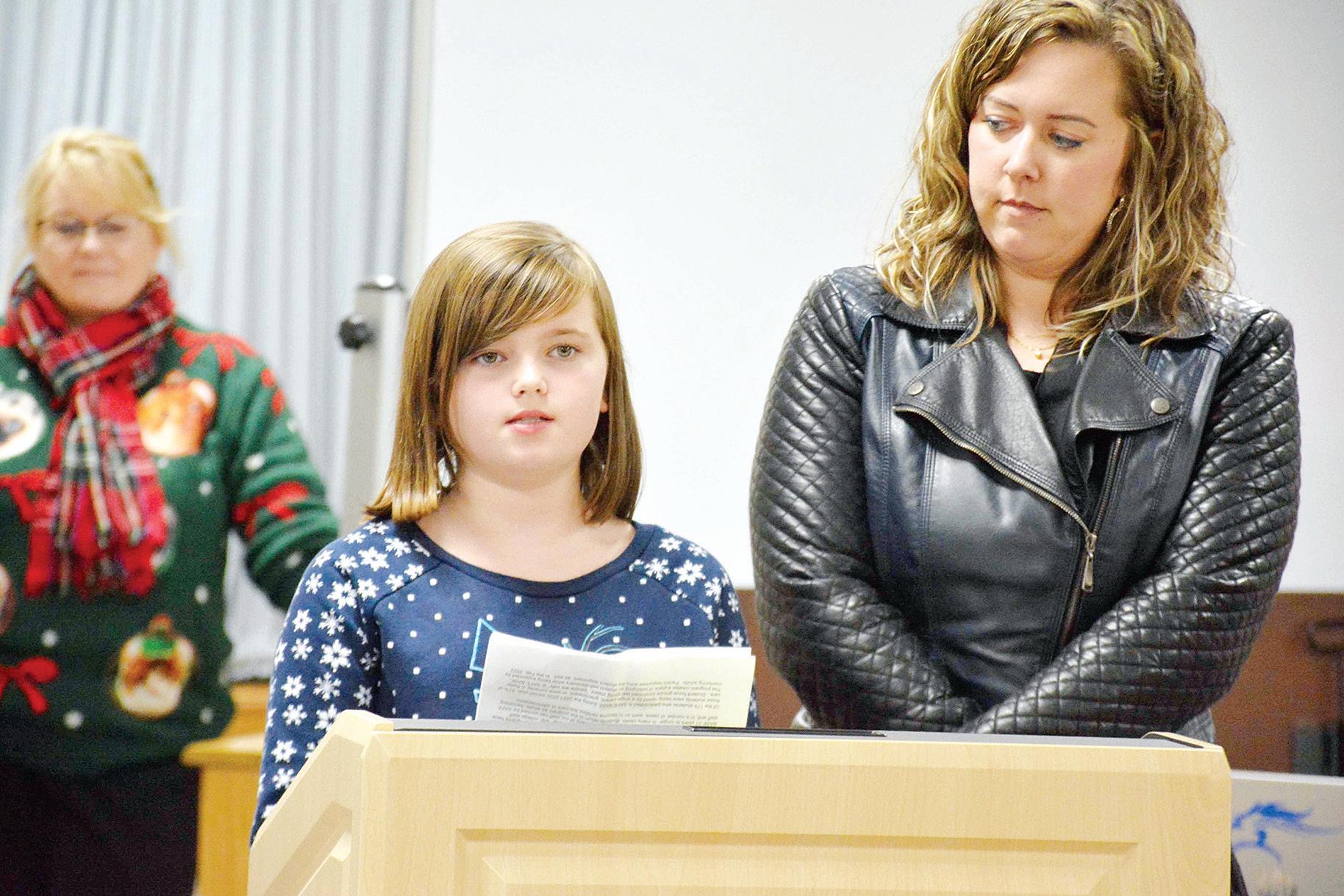 Tessa Lou Francis, 8, speaks with Humboldt City Council members Monday about her request to raise chickens inside city limits. REGISTER/SUSAN LYNN