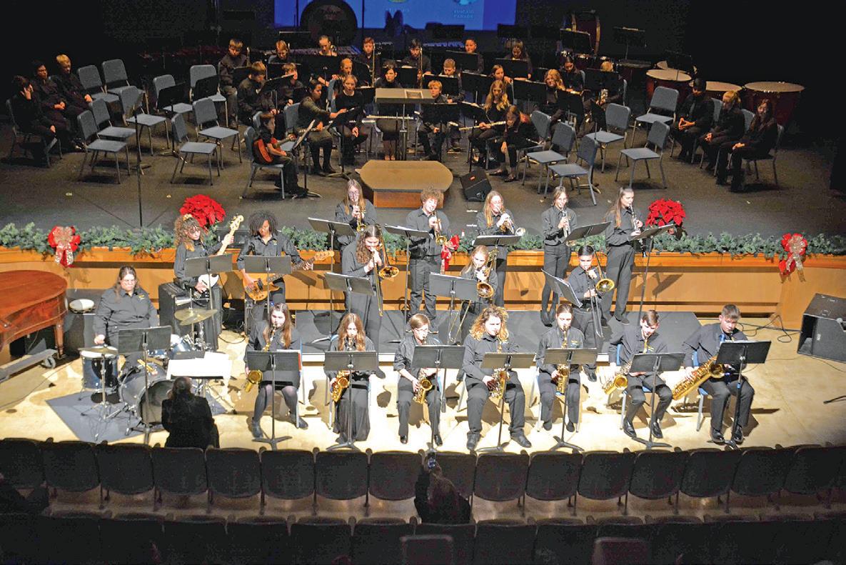 The Iola Middle and High school bands performed a variety of holiday-themed numbers during a concert on Monday evening. Above, the high school jazz band performs a Christmas medley. Below, the combined middle and high school jazz bands play “Let It Snow! Let It Snow!” The bands are under the instruction of Brandi Holt. REGISTER/VICKIE MOSS