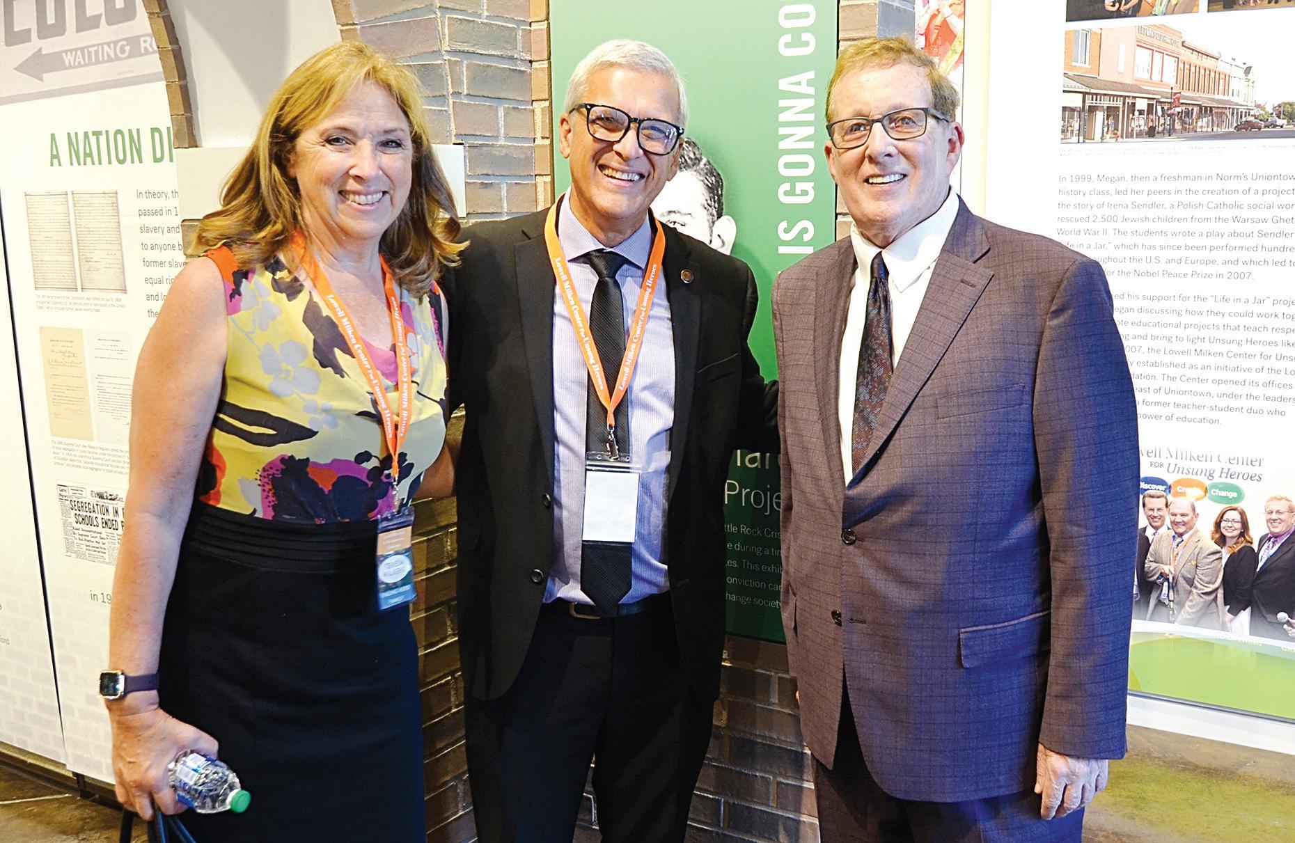 Carl Wilkens, center, an “unsung hero” for his work as a pastor and missionary during the Rwanda Genocide in 1994, poses for a picture with wife Teresa and Norm Conard, chief executive director of the Lowell Milken Center For Unsung Heroes in Fort Scott Monday. REGISTER/RICHARD LUKEN
