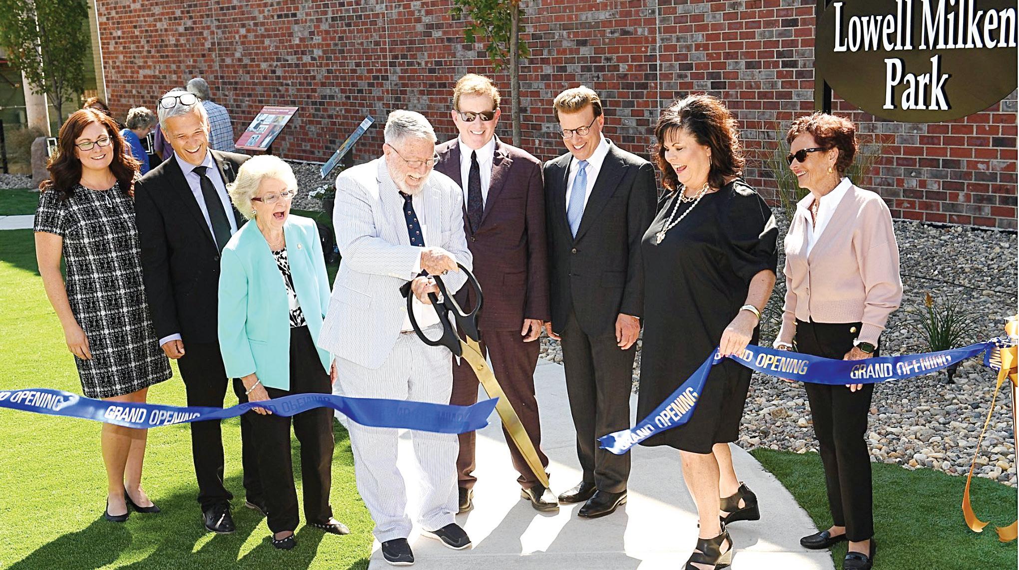 Taking part in a ribbon-cutting ceremony to unveil Lowell Milken Park at the Milken Center for Unsung Heroes in Fort Scott are, from left, Milken Center program director Megan Felt, Carl Wilkens, an “unsung hero” during the Rwanda genocide, former Executive Director of the Na tional Teachers Hall of Fame Dr. Carol Strictland, Skipper Higgins, son of World War II “unsung hero” Andrew Higgins, Milken Center chief executive drirector Norm Conard, Lowell Milken, Fort Scott Mayor Lindsay Madison and Milken Center Park Committee Chair Beth Nuss.