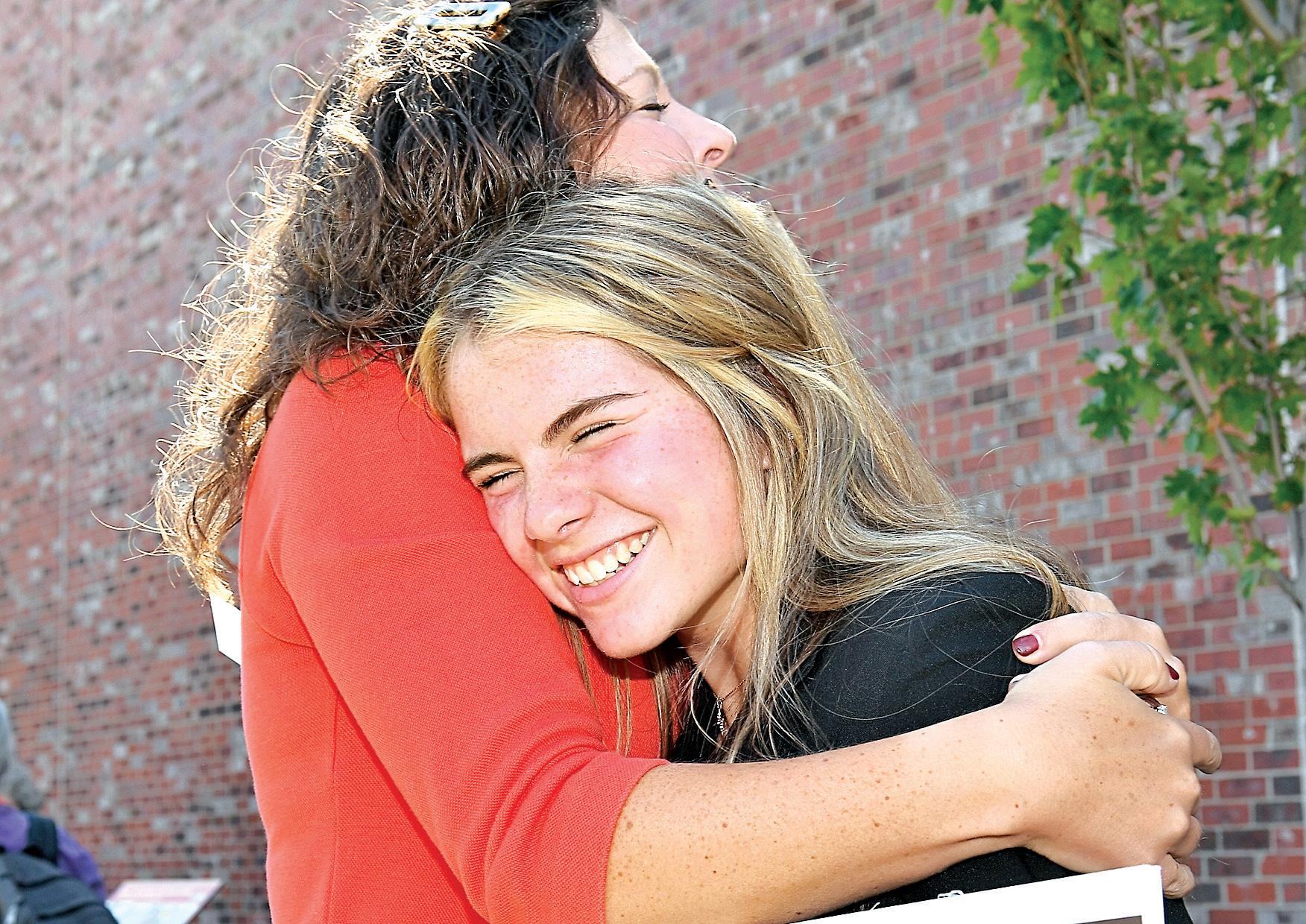 Gracie Conrad, a high school junior from Nebraska, gets a hug from her teacher, Megan Hel berg, after she was named Monday the grand prize winner of the 2022 Lowell Milken Center Discovery Award for her documentary of World War II heroine Betty Goudsmit-Oudkerk. The ceremony came during the 15th anniversary celebration of the Lowell Milken Center for Un sung Heroes in Fort Scott. PHOTOS COURTESY OF LOWELL MILKEN FOUNDATION