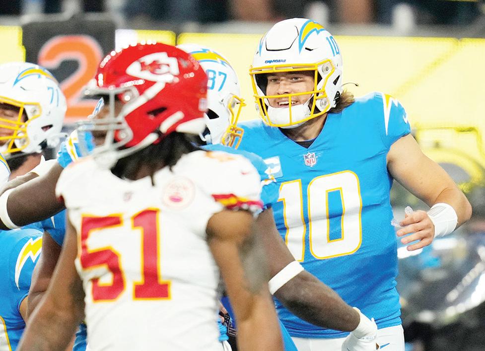 Los Angeles Chargers quarterback Justin Herbert playing against the Chiefs on Dec. 16, 2021. PASADENA STAR-NEWS/TNS