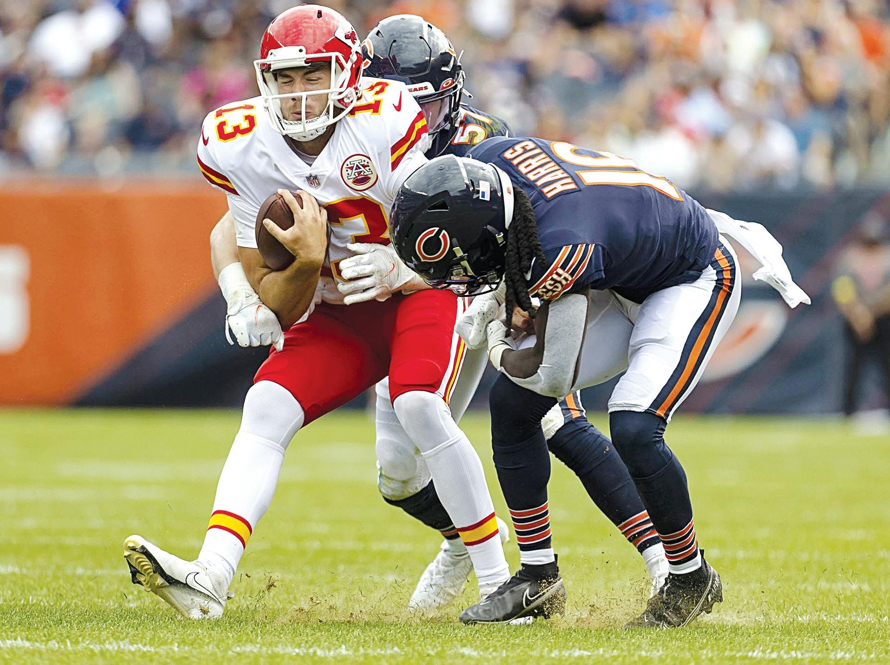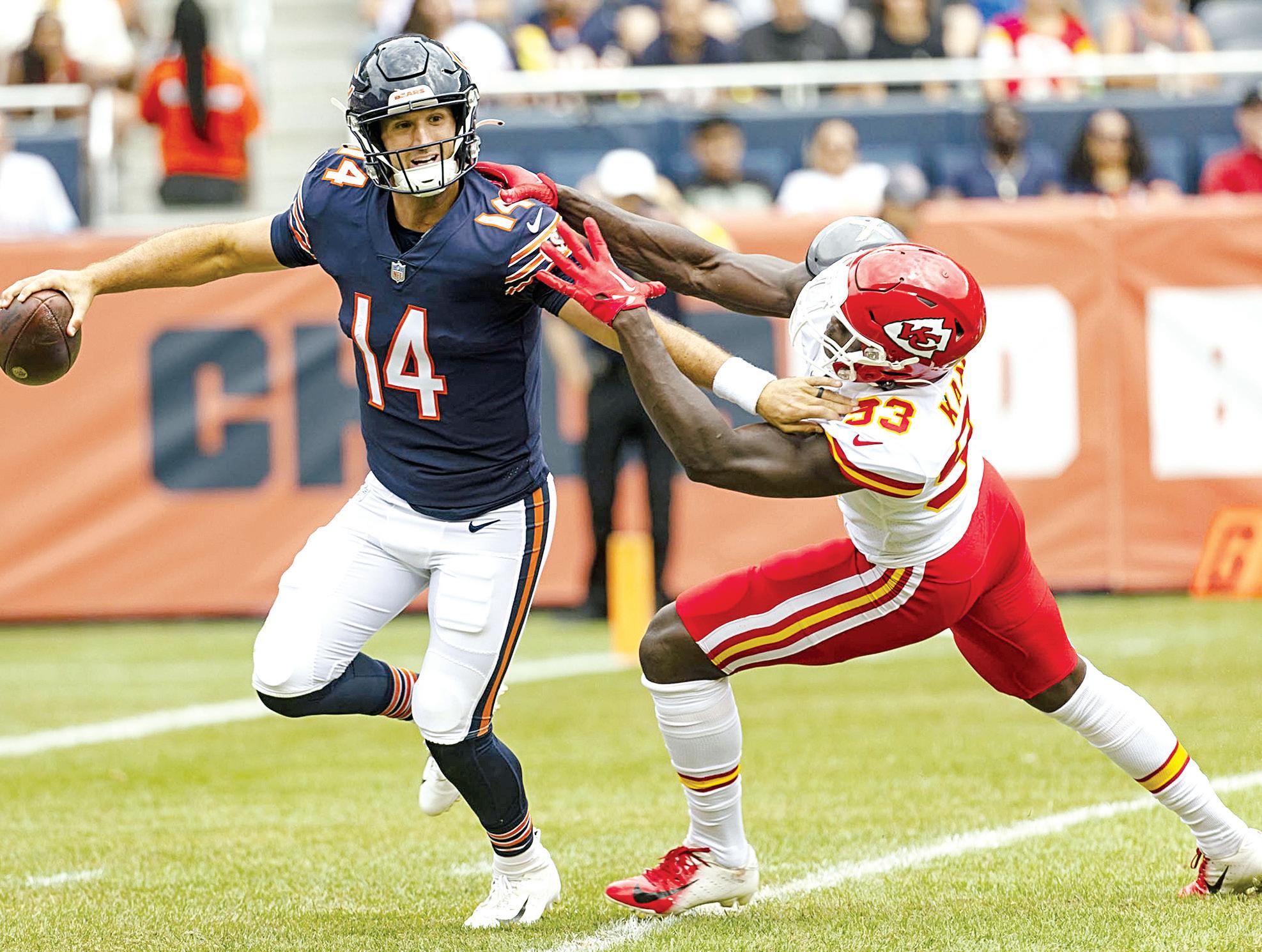 Field conditions draw union’s Starters shine in brief appearance from B1 Chicago Bears quarterback Nathan Peterman (14) scrambles away from Kansas City Chiefs defensive end Azur Kamara (93) Saturday.