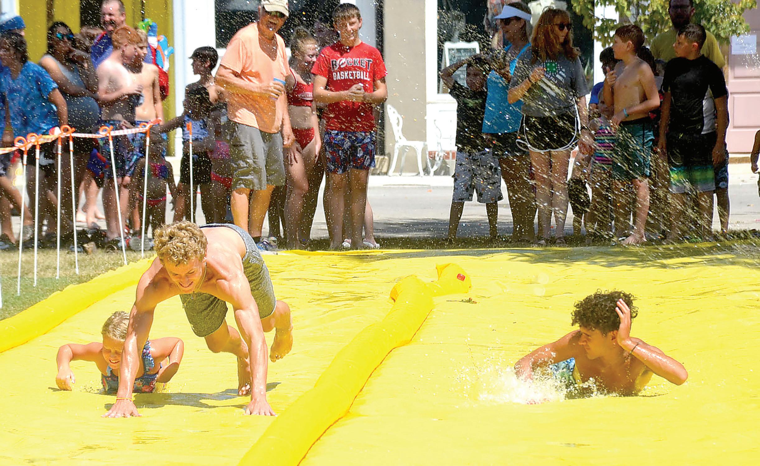 Water Wars returned to Hum boldt on Saturday, drawing a crowd of about 3,000 for the parade, where float partic ipants soaked the crowd — and the crowd fired back. At left, the B&W Trailer Hitches float featured a shark attack, with Kenzie Gant, left, and Beth Barlow targeting the crowd with water blasters. Below, the giant slip and slide proved quite popular. To view more photos go