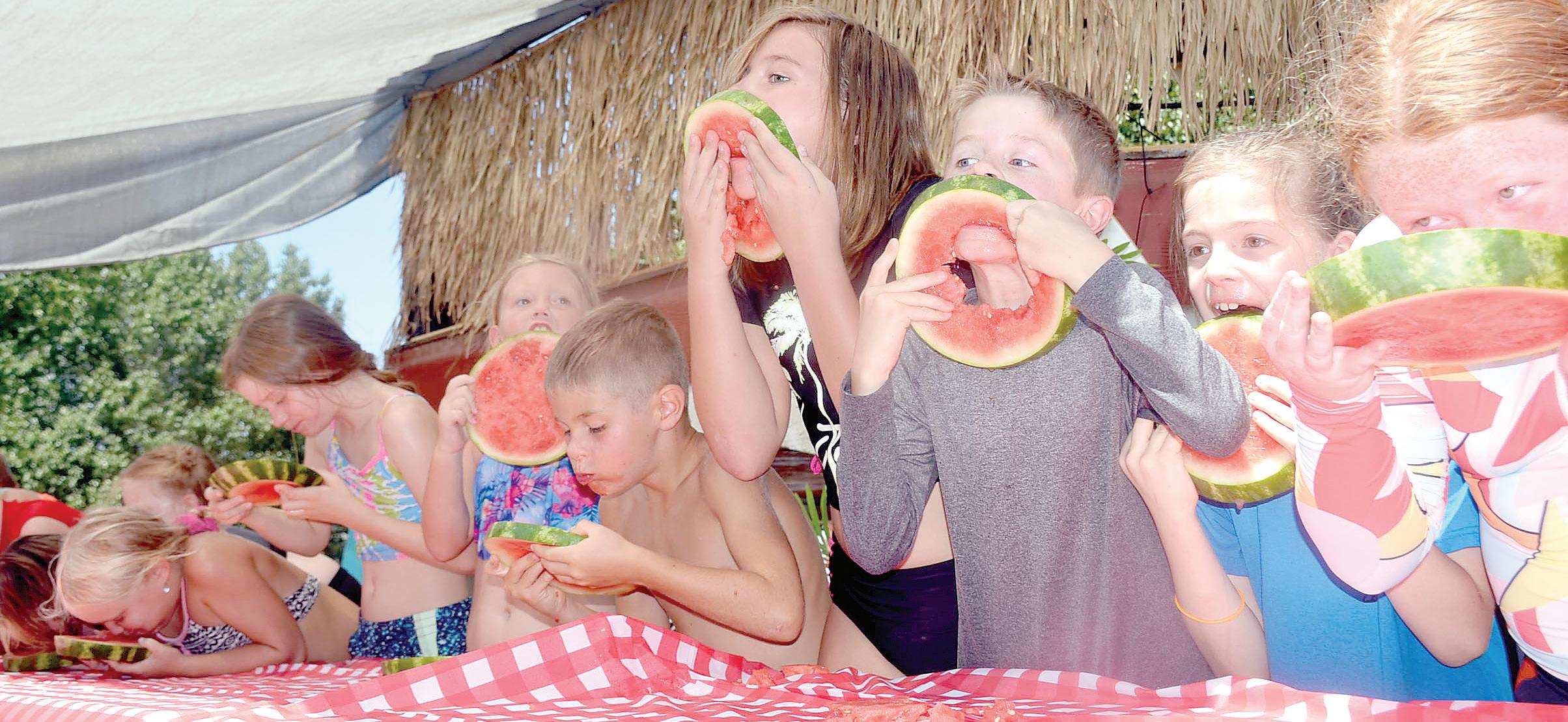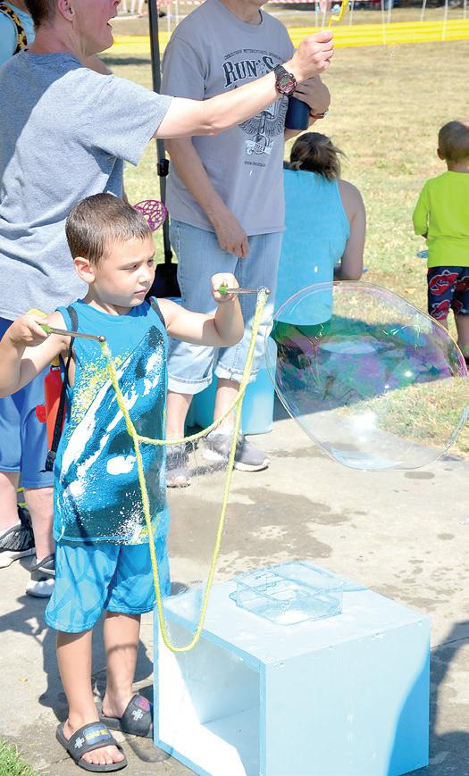 Jace LaCrone shows off his bubble-making skills. At left, the Water melon Eating Con test drew a large crowd of contes tants in both the youth and categories.adult
