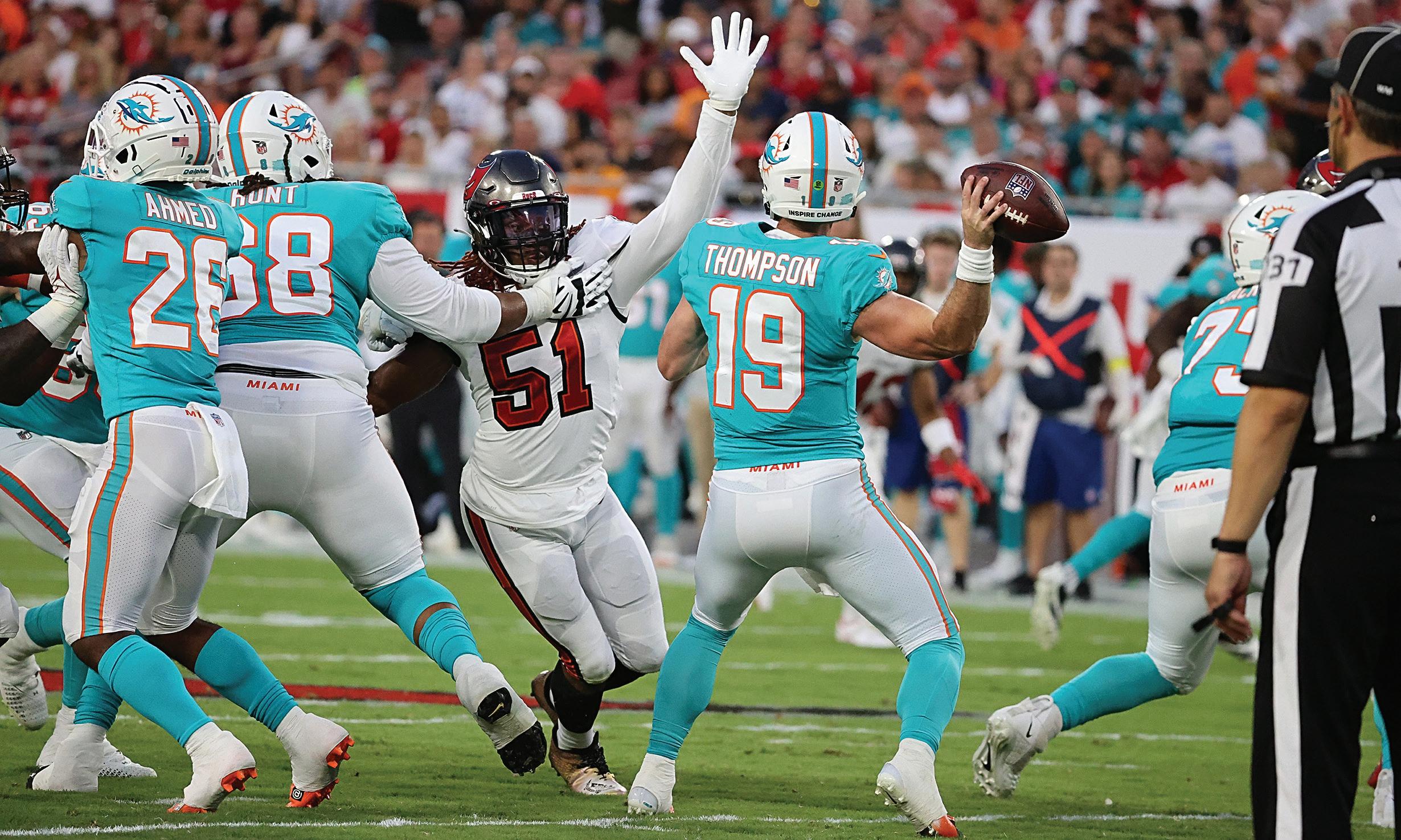 Continued from B1 Tampa Bay Buccaneers linebacker J.J. Russell (51) challenges Miami Dolphins quarterback Skylar Thompson (19) during the second quarter of the preseason game on Saturday in Tampa.