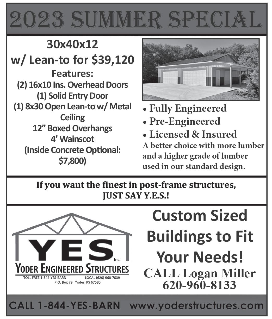 B6 Wednesday, August 16, 2023 iolaregister.com The Iola Register • Lots of storage units of various sizes • Boat & RV Storage building • Fenced - under lock & key - supervised 24/7 • RV park for trailers and self-contained vehicles • Concrete pads & picnic tables • Ferrellgas propane sales • Laundry & shower facilities (620) 365-2200 1327 W. Hwy. 54 jocksnitch.com 101 E. Madison Ave., Iola My Cool Neighbor LLC Heating, Cooling and Home Services Derrick Foster Owner Office: (620) 380-6196 Cell: (816) 699-4473 Contact@MyCoolNeighbor.com MyCoolNeighbor.com Tai Lee 620-228-4363 Jacob T. Manbeck, Esq. 10 E. Jackson | Iola, KS 66749 | (620 jacob@manbecklaw.com | manbecklaw.com 118 E. Jackson Ave. Iola, KS 66749 620-365-2201 201 W. Madison, Iola We have all the quality materials you need FOR THE PROJECTS YOU DO commercial-residential licensed-insured office 620-365-6684 cell 620-496-9156 Danny Ware Miller’s Gas Body Shop Gas Body Shop Hwy. 54 in Gas • (620) 365-6136 • 8 a.m.-5 p.m. Mon. -Fri. David (Duke) Miller, owner Collision Repair and Painting We treat your car right...the rst time! We guarantee it! 511 S. State Street, Iola, KS Tire Sales & Service 620-365-3163 Mechanic Shop Goodyear • Firestone Bridgestone Toyo Mastercraft Cooper JD’s TIRE & AUTO PROFESSIONAL SERVICE AT A FAIR PRICE 202 S. State • Iola • Headstones • Final Dates • Setting & Straightening • Vases Granite Memorials O’Shaughnessy Liquor Brian and Lindsey Shaughnessy (620) 365-5702 1211 East Street • Iola 1304 East St. • Iola, KS Come see us at our new location for all your tire & mechanic needs! Mon.-Fri. 8:00 a.m. - 5:30 p.m. Sat. 8:00 a.m. - 12:00 p.m. HOURS: BUSINESS DIRECTORY 6-8 times/month • $100/1 Mo. • $200/3 Mo. Read local. Shop local. CUSTOMIZED HEALTHCARE ACUPUNCTURE • SPORTS INJURIES NUTRITION & ALLERGY TREATMENTS MOST INSURANCE ACCEPTED Duane’s Flowers 5 S. Jefferson Ave. Iola, KS 620-365-5723 duanesflowersiola.net Kristina DeLaTorre – Owner Serving Southeast Kansas Locations in Bourbon & Allen County 2103 S. Sante Fe • Chanute, KS 620-431-6070 cleaverfarm.com