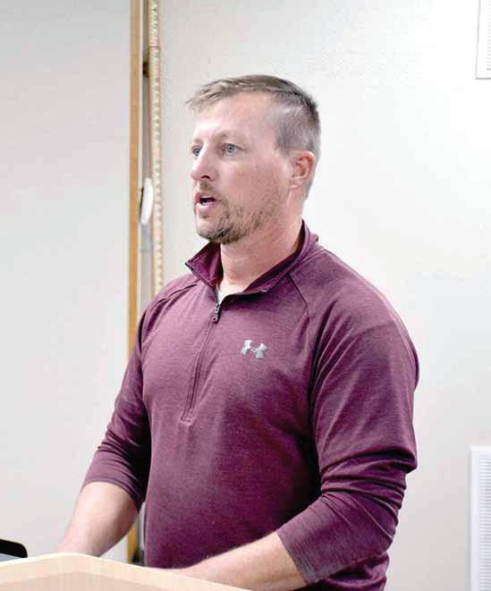 Architect John Davidson speaks to Iola City Council members Monday about a planned construction project for PrairieLand Partners on land recently annexed at the northeast edge of the city. Behind him, at right, is PrairieLand marketing and facilities manager Drue Durst. Also listening, at left, is Assistant Iola City Administrator Corey Schinstock. REGISTER/TIM STAUFFER
