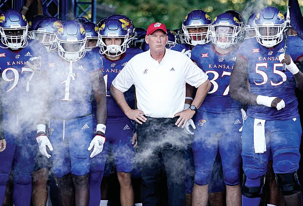Head coach Lance Leipold of the Kansas Jayhawks stands with his players prior to their season-opener against Tennessee Tech. The Jayhawks are 2-0 for the rst time in 11 years. GETTY IMAGES/ED ZURGA/TNS
