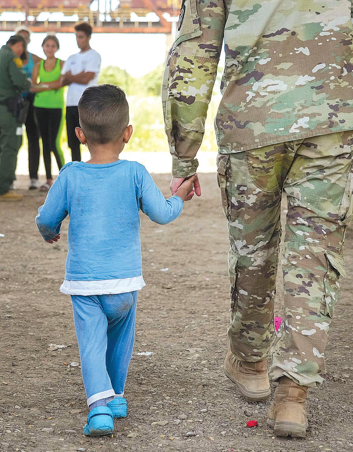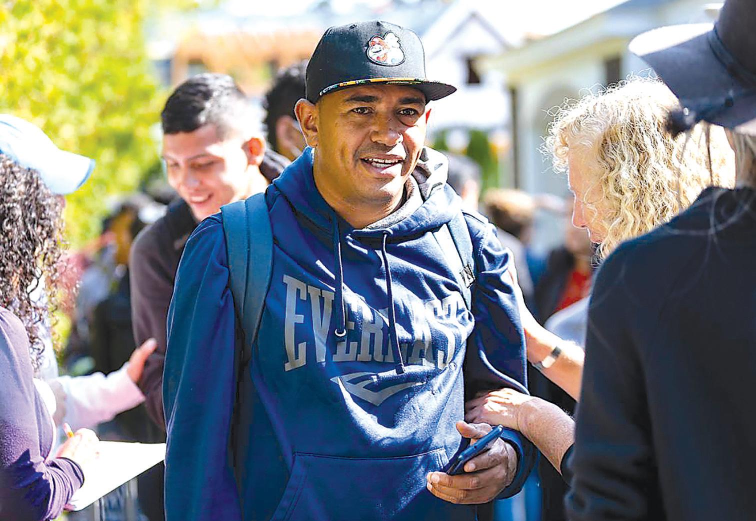 A Venezuelan migrant is led onto a bus at St. Andrews Episcopal Church on Fri day, Sept. 16, in Edgartown, Mass. on the island of Martha’s Vineyard. TNS