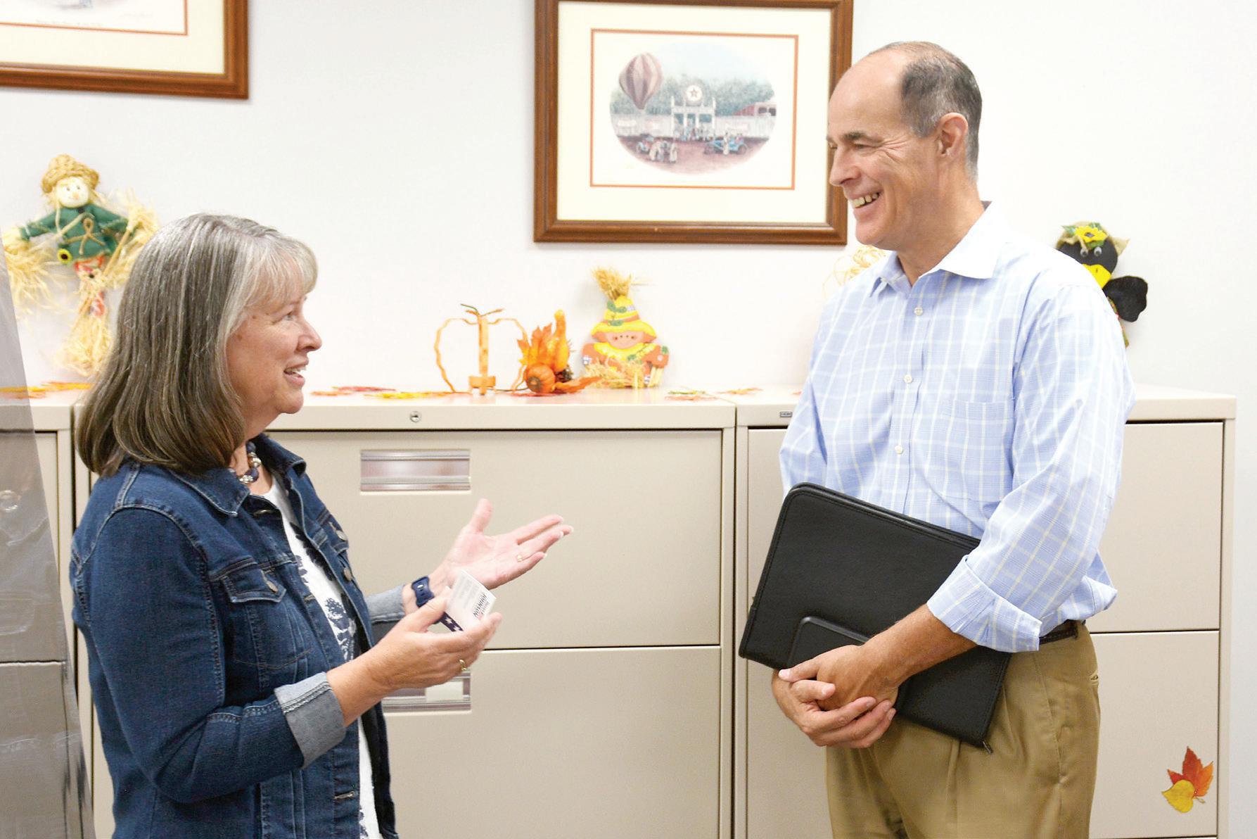 Allen County Clerk Sherrie Riebel, left, speaks with Kansas Treasurer candidate Steven Johnson, a Republican from Assaria. REGISTER/RICHARD LUKEN