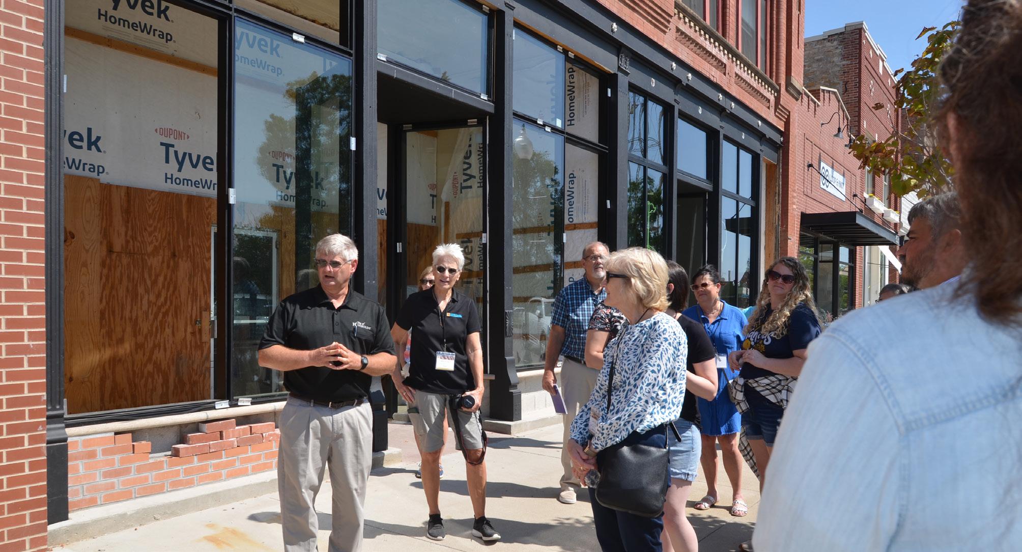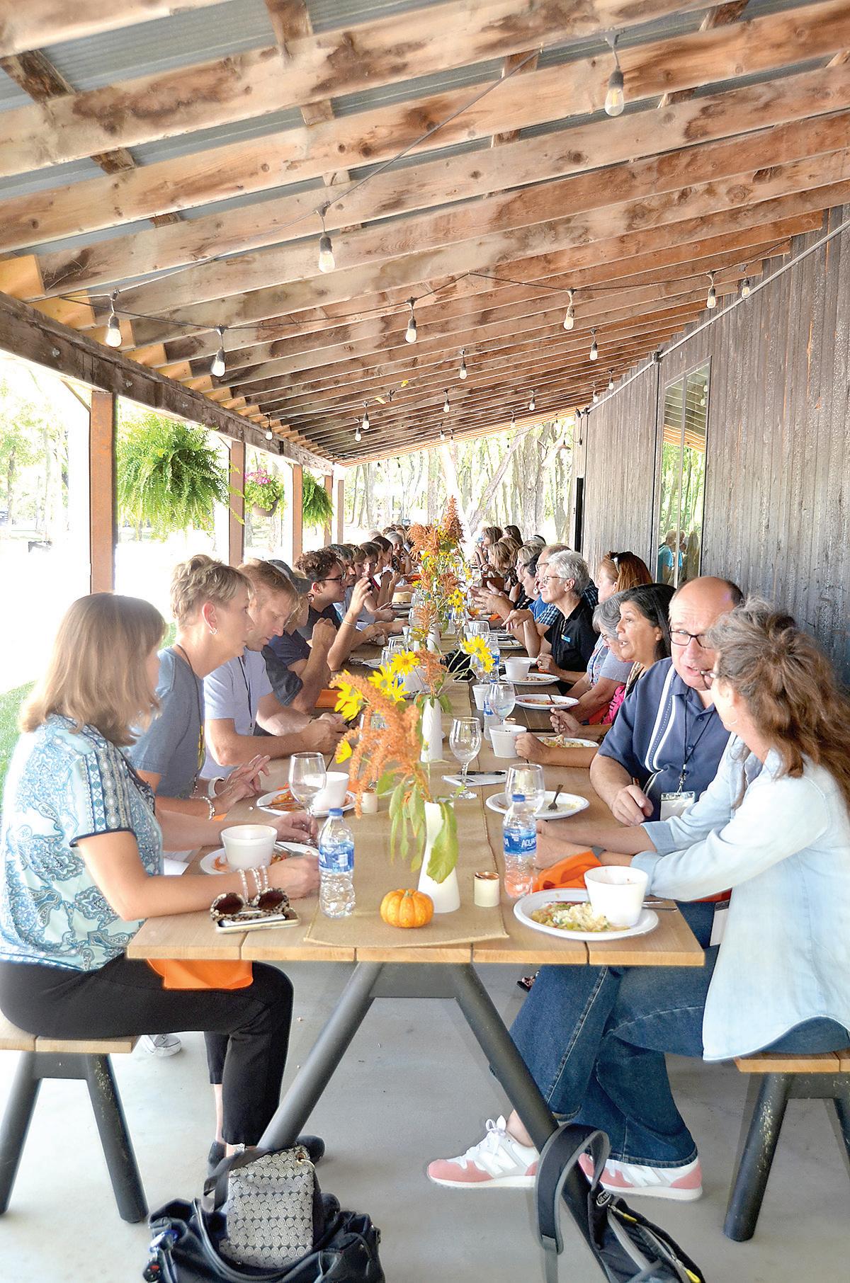 About 50 Kansans from across the state spent the better part of Tuesday in Humboldt learning about its building boom. The Kansas Sampler Foundation hosted the group and A Bolder Humboldt orchestrated the tour. Pictured above, the group enjoys lunch on the veranda of the bike barn at Base Camp. Miles Kim of the Leawood-based restaurant Rye catered the meal. Kim is due to open the restaurant Calamity Mae’s in downtown Humboldt before year’s end. REGISTER/SUSAN LYNN