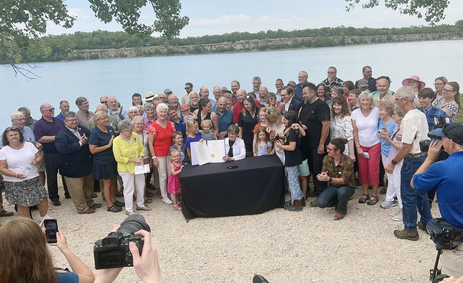 Kansas Gov. Laura Kelly, center, is flanked by a boisterous crowd Monday as she signs a bill officially creating the Lehigh Portland State Park in Iola. REGISTER/RICHARD LUKEN
