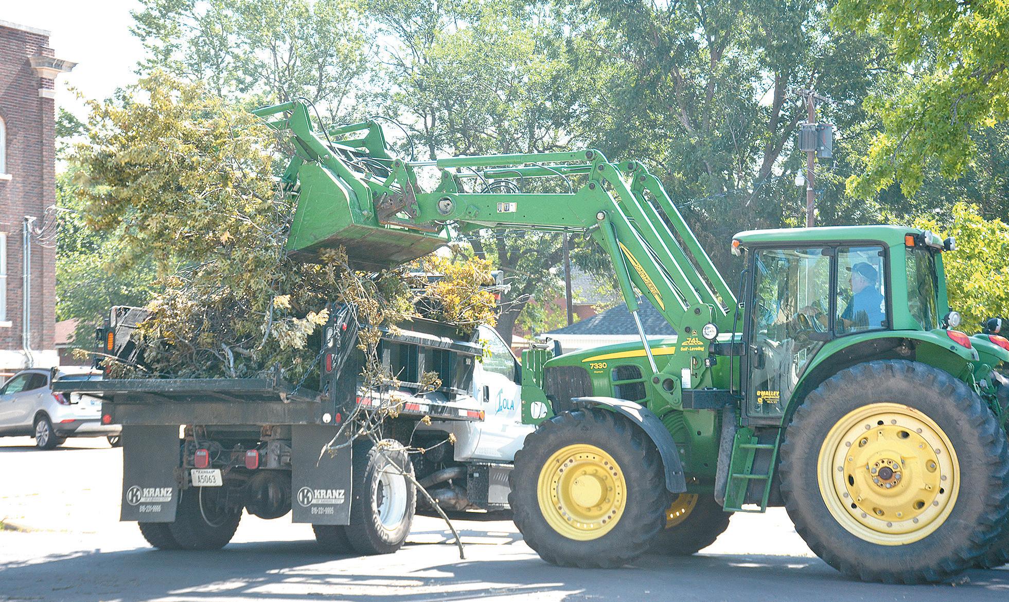 Crews with the City of Iola have been picking up tree limbs and brush around the city this week. On Wednesday morning, this group worked on South Buckeye Street. Here, a tractor piles limbs into a dump truck near Wesley United Methodist Church and the Bowlus Fine Arts Center. REGISTER/VICKIE MOSS
