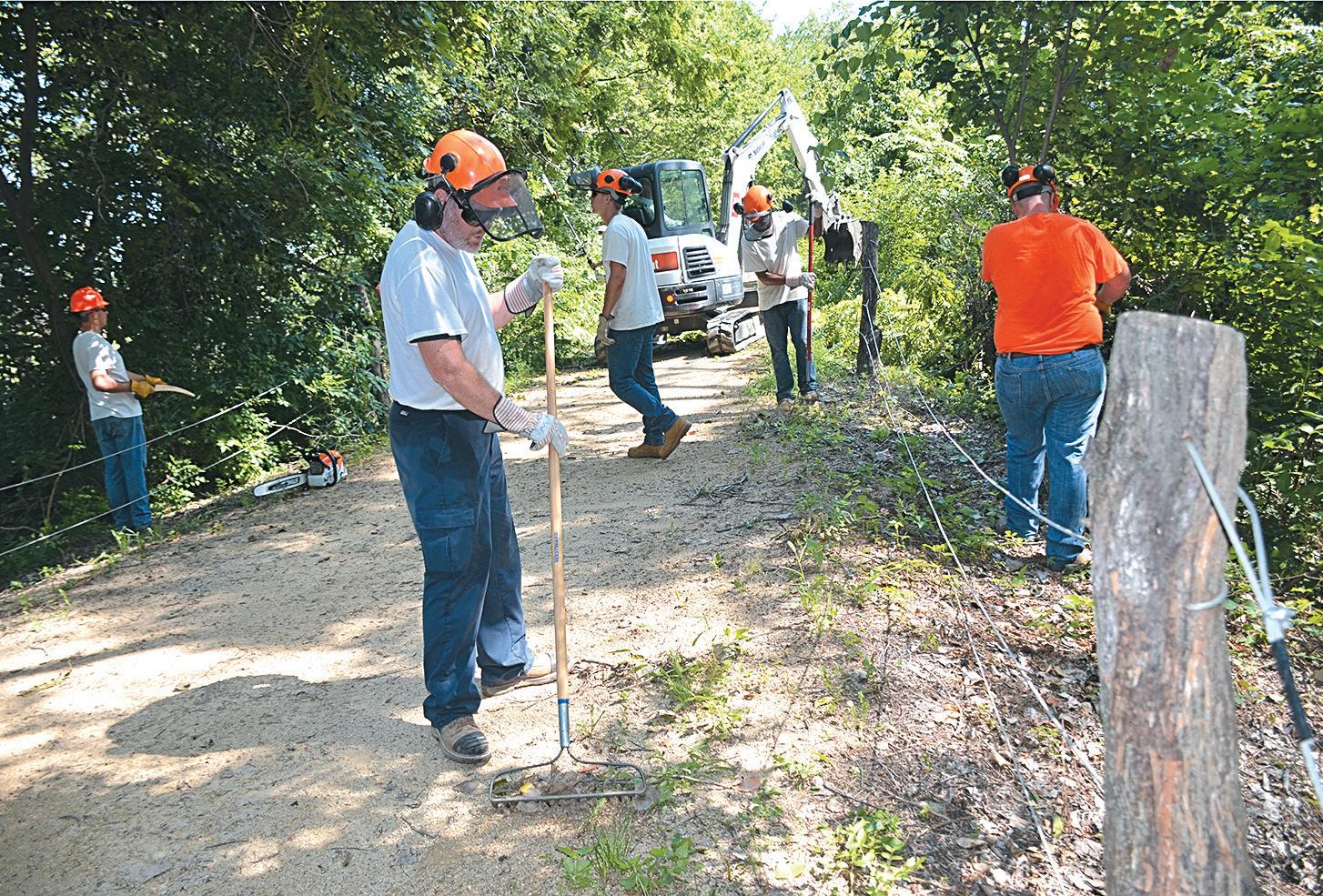 A team of Kansas Department of Wildlife and Parks workers helped remove mangled branches and uprooted trees that blocked the Southwind Rail Trail. REGISTER/RICHARD LUKEN