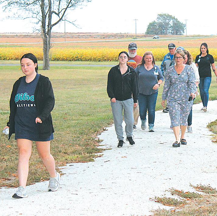 Luminaries at Allen County Regional Hospital remember those lost to suicide. At right, thosegathered walk the trail around the hospital campus Tuesday. REGISTER/TIM STAUFFER