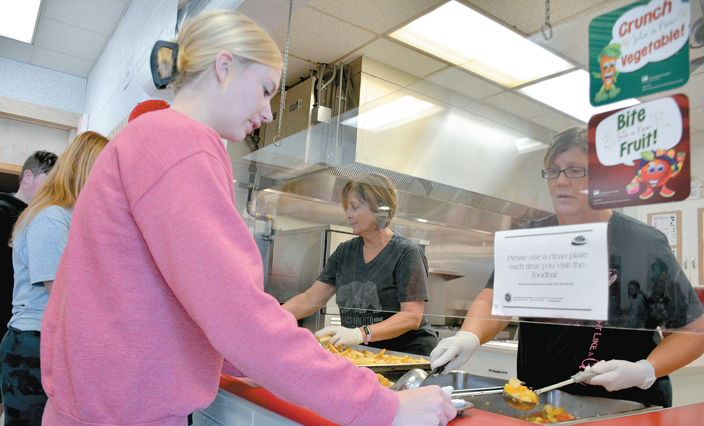Crest High School student Kinley Edgerton watches as cafeteria staff Cindy Rhodes, at left, and Connie Johnston, load food onto her tray during lunchtime Monday afternoon. A school bond proposal would renovate and expand the cafeteria; high school students are split between the lunchroom and a classroom during mealtimes because of the tight space. REGISTER/VICKIE MOSS