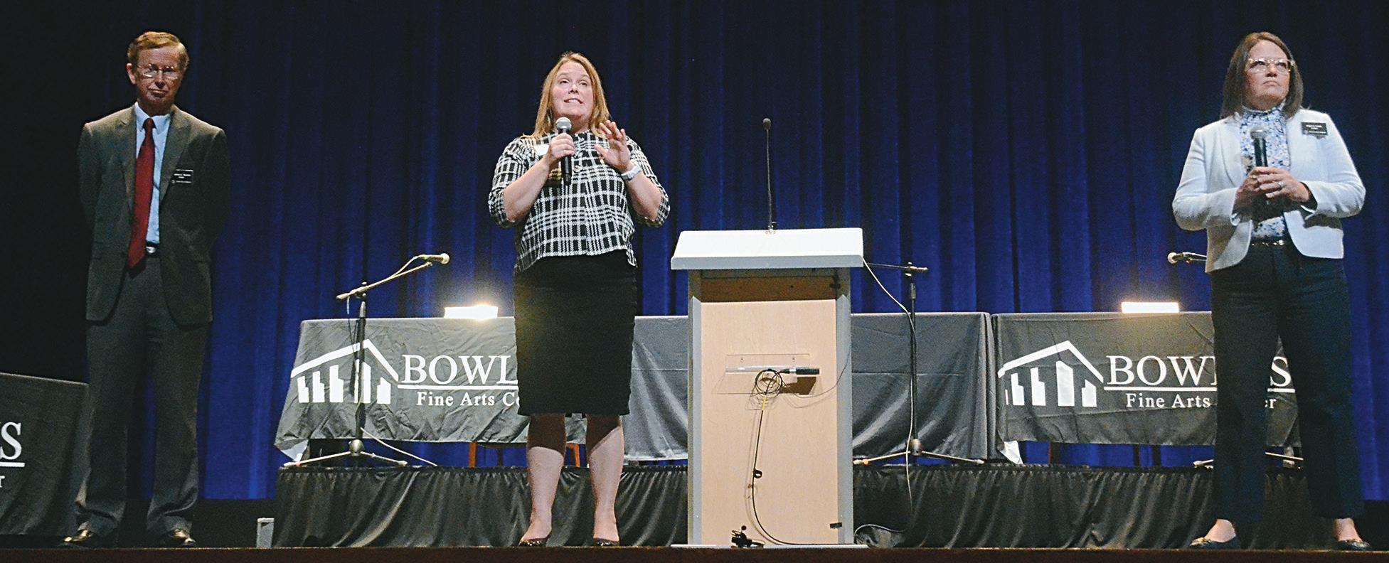 Kansas appellate judges Thomas Malone, from left, Sarah Warner and Angle Coble speak to a group of about 600 high-schoolers Tuesday at the Bowlus Fine Arts Center in Iola. REGISTER/RICHARD LUKEN