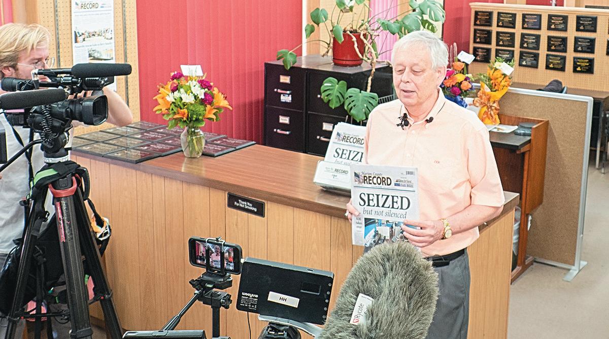 Marion County Record publisher Eric Meyer holds a copy of the Wednesday paper, featuring the headline “SEIZED … but not silenced,” during a news conference at the newspaper office. KANSAS REFLECTOR/SHERMAN SMITH
