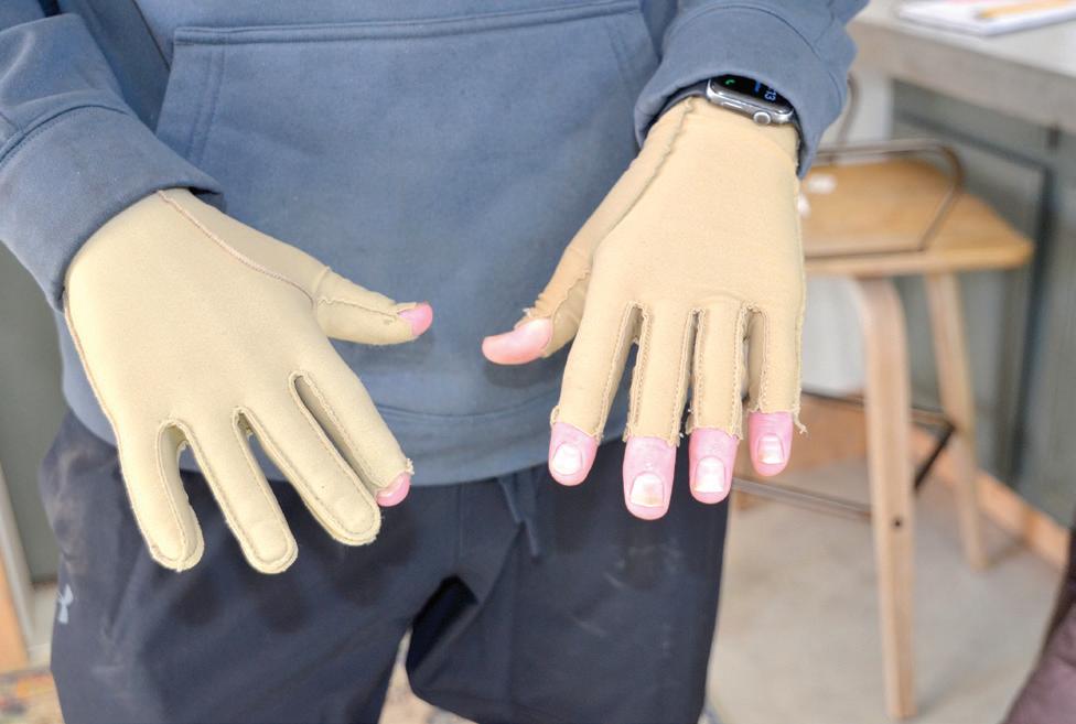 Austin’s torso is swathed in bandages. His gait is stiff and slow. Picking up items remains a challenge be cause the nerve endings in his fingers are still damaged and extreme ly tender. The slightest pressure can tear the newly forming skin. Af ter sitting for any length of time it’s a challenge to get up. Likewise, it’s a challenge to sit because the newly grafted skin is “tight.”