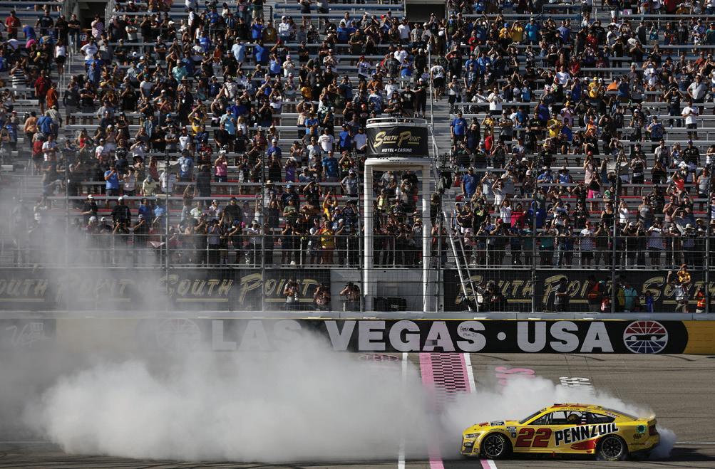 Joey Logano, driver of the #22 Shell Pennzoil Ford, celebrates with a burnout after winning the Cup Series South Point 400 at Las Vegas Motor Speedway Sunday (Sean Gardner/Getty Images)
