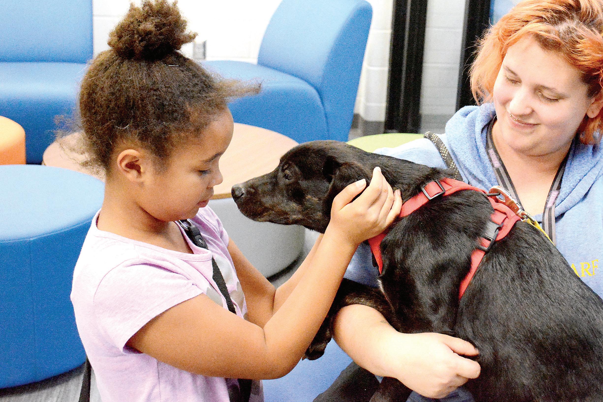 Remy, though still a puppy, was selected because he loves people, handler and ACARF employee Nikki Victor said. But as the throng of children and adults walked through the hallway, Remy sat qui et and cautious in a corner. He perked up when Auri re turned for a second round of petting.