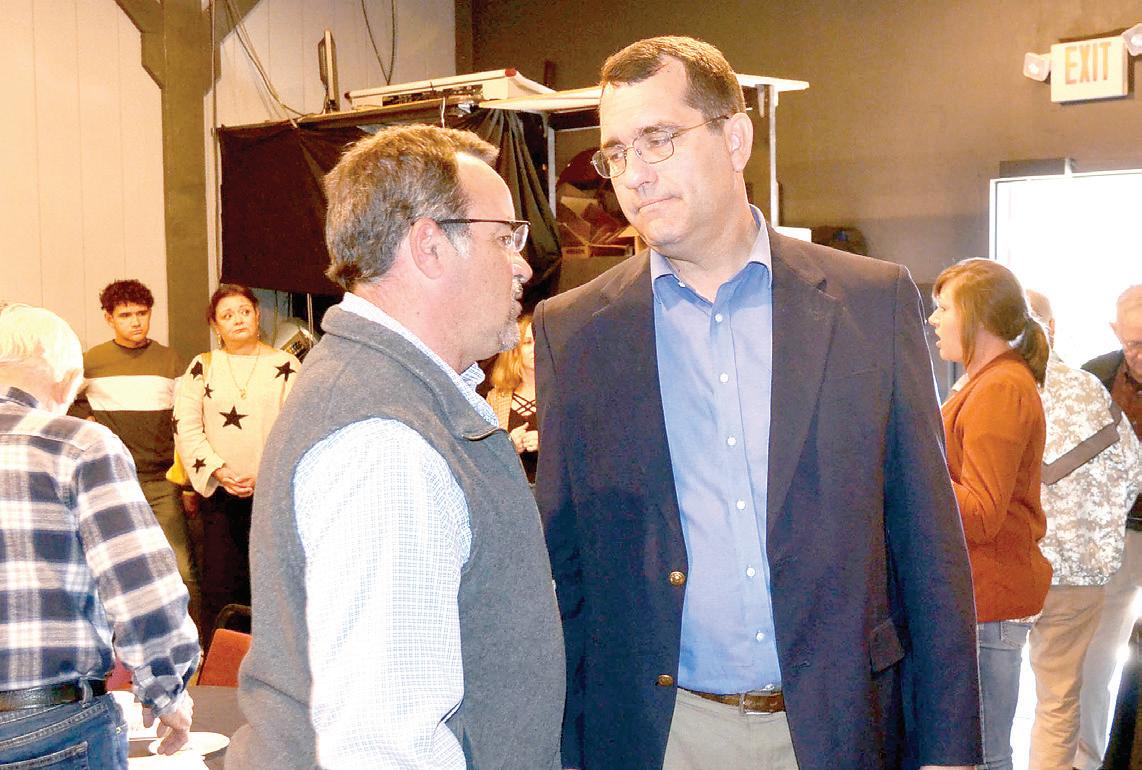 Kansas Republican gubernatorial candidate Derek Schmidt, center, talks with retiring Rep. Kent Thompson at a campaign stop in Iola on Thursday.