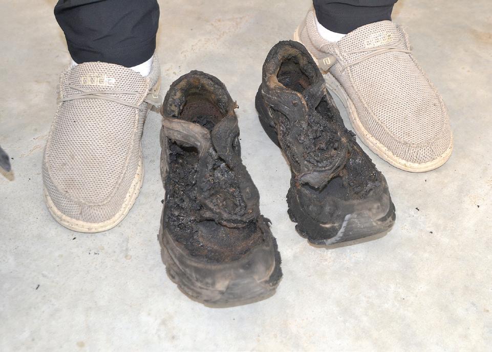 Though Emily thinks it’s morbid, Austin has held on to the clothing he wore that day. He holds up the Dickies brand shorts that are now just short of trans parent. His shoes are a molten black glob. His shirt is more of a sheet from where the para medics cut it off his body. Only the bill re mains of his hat.