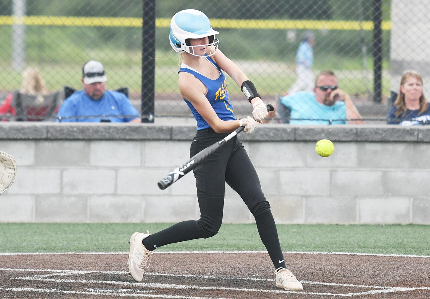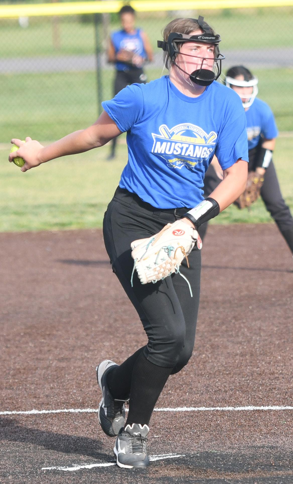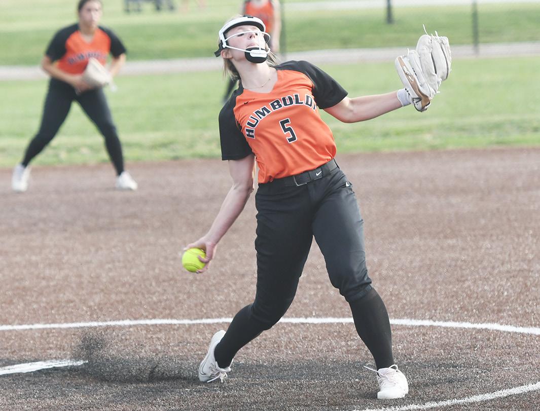 The Iola and Humboldt High summer softball teams were in action in Chanute Wednesday. At left, Iola freshman Zoie Hesse pitches to Chanute; above, Iola’s Alana Mader swings at a pitch, and below, Humboldt’s Shelby Shaughnessy pitches in game two.
