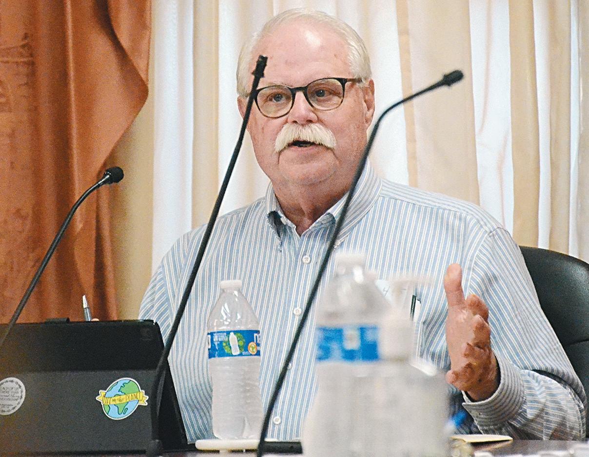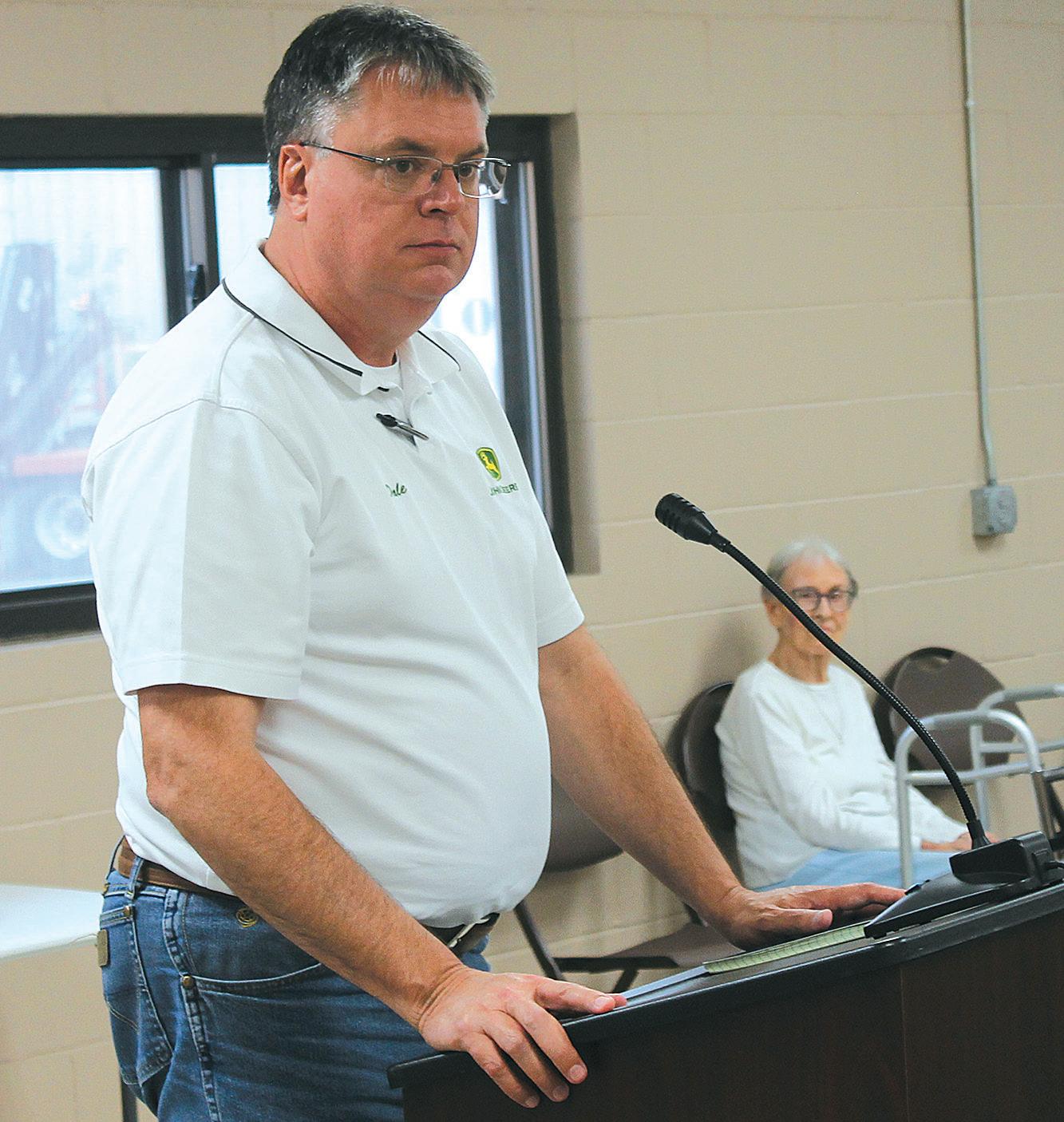 Dale Lalman of PrarieLand Partners speaks Monday with Iola City Council members about the John Deere dealership’s plans to build a new facility at the edge of Iola. In the background is Sally Huskey, who owns the land for the new site. REGISTER/TIM STAUFFER