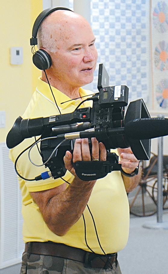 Chris Frank, at left, is a senior producer for PBS Kansas, and is creating a documentary on the Iola Muncipal Band, which completed its summer session Thursday. The band has played summer concerts for the past 152 years. REGISTER/RICHARD LUKEN