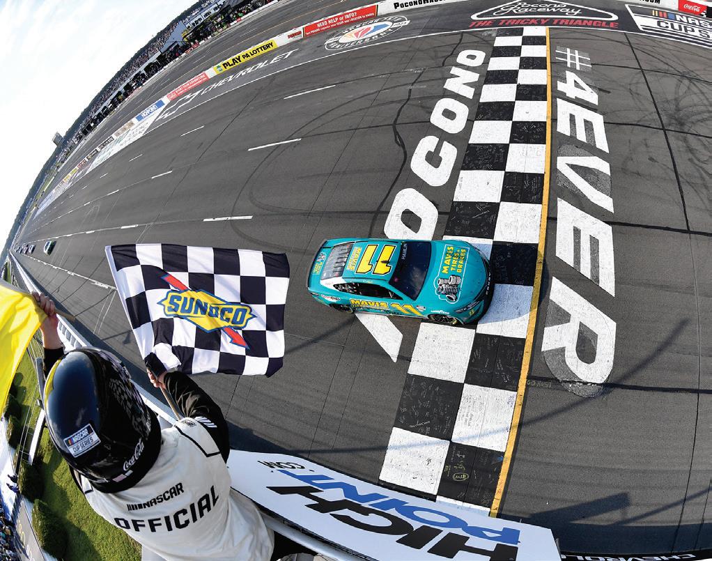 Denny Hamlin, driver of the #11 Mavis Tires & Brakes Toyota, takes the checkered flag under caution to win the Cup Series Highpoint.com 400 at Pocono Raceway Sunday. (Logan Riely/Getty Images)
