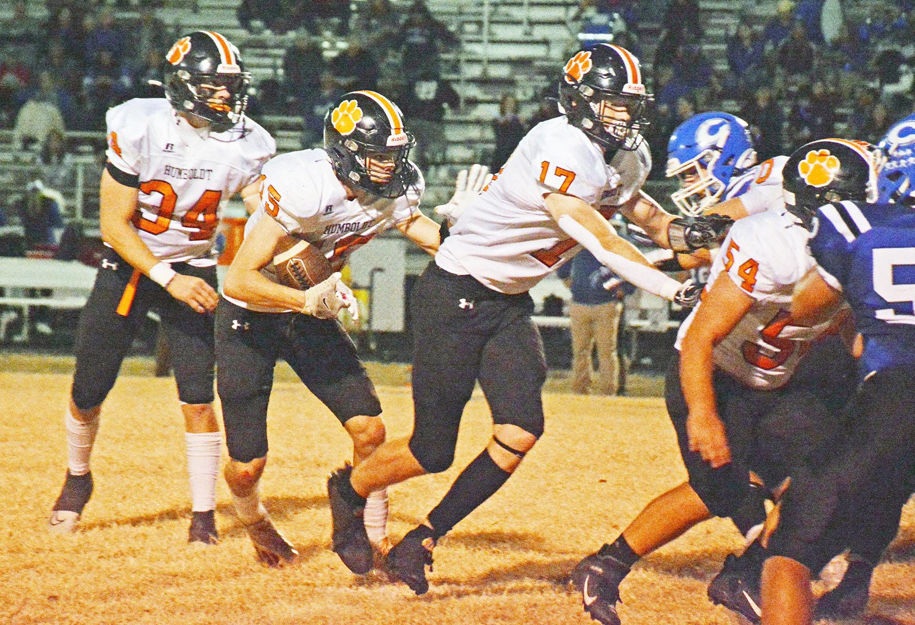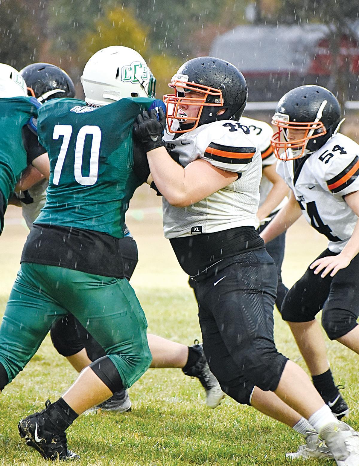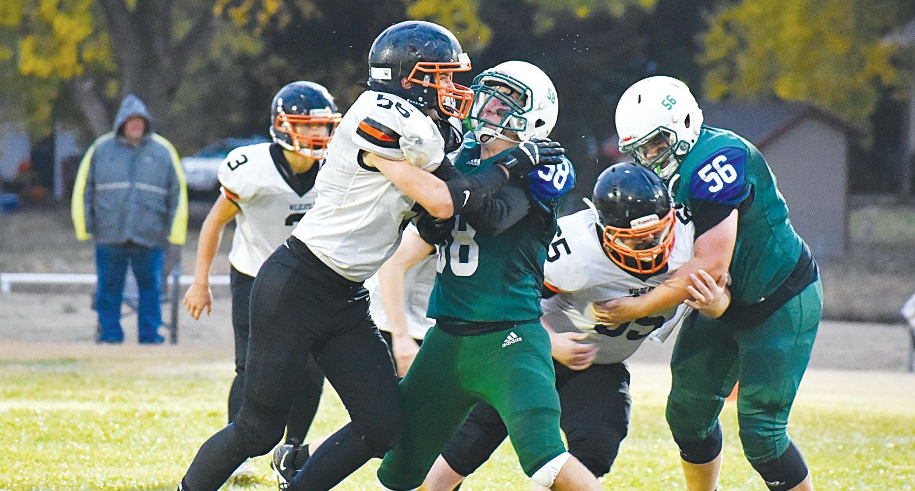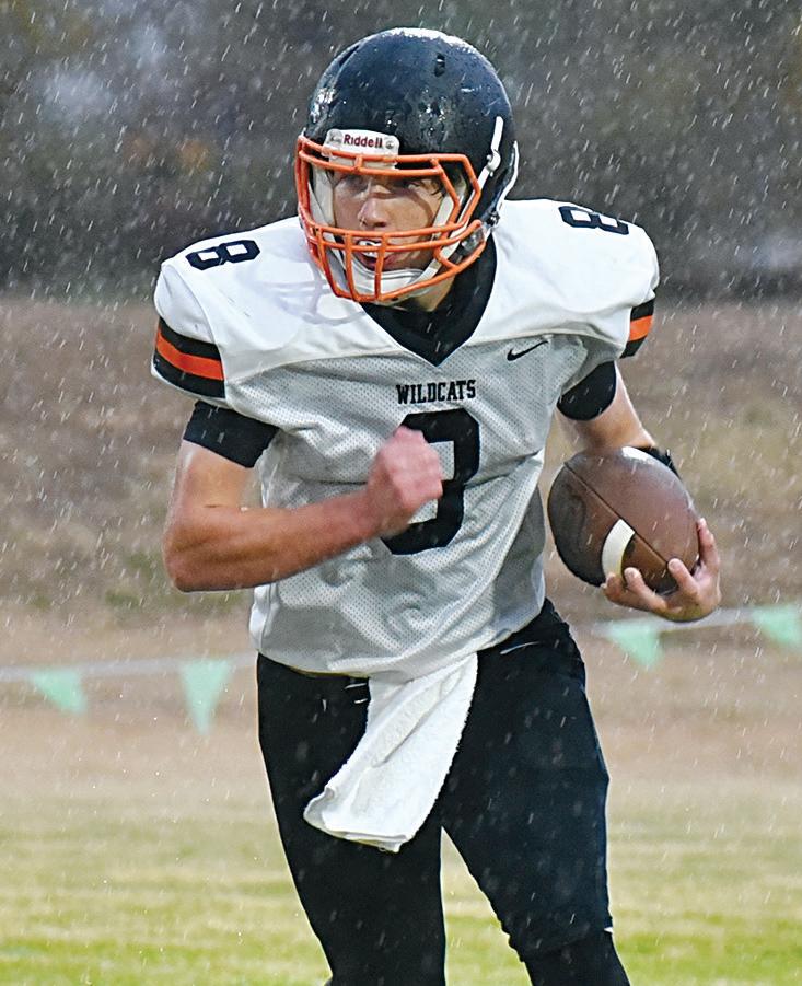 an end Thursday with the Wildcats falling to Hutchinson’s Central Christian High, 52-6, in the first round of the Kansas Eight Man-II playoffs. A steady downpour made life a bit messier for players and spectators alike. Above, Wildcat defenders Bryce Ensminger (55) and Daniel Fewins (65) take on Cougar blockers in a play. Below at left, Marmaton Valley’s Cesar Morales blocks a Central Christian defender. At lower right, Wildcat quarterback Brayden Lawson carries the ball in the rain. Statistics from the game were unavailable by press time. Central Christian advances to take on unbeaten Axtell, the state’s top-ranked eight man-II squad. PHOTOS BY HALIE LUKEN/MVHS