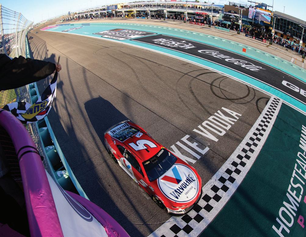Kyle Larson, driver of the #5 Valvoline Chevrolet, takes the checkered flag to win the Cup Series Dixie Vodka 400 at Homestead-Miami Speedway Sunday (Jared East/Getty Images)