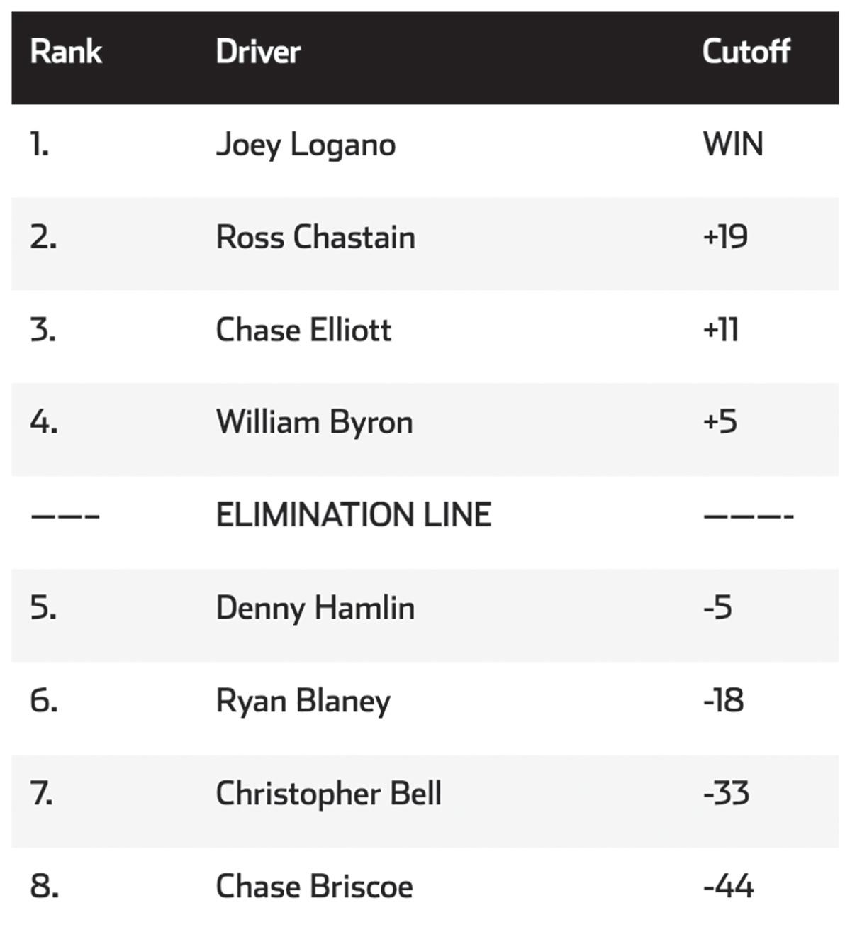 Denny Hamlin, Blaney, Christopher Bell and Chase Briscoe are all below the cutline headed into Sunday, with Bell and Briscoe essentially needing a victory to make the final four. Ross Chastain, Elliott and Byron are above the cutline, and only 32 points separate Chastain in second from Blaney in sixth.