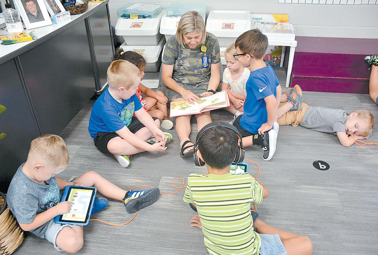 Iola Elementary School preschool teacher Jalayne Nelson reads a book to 4-year-old students