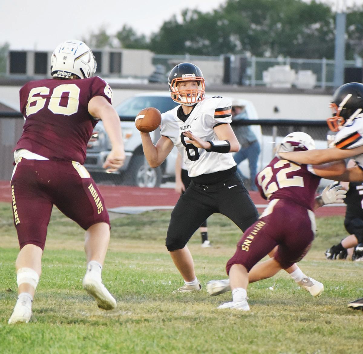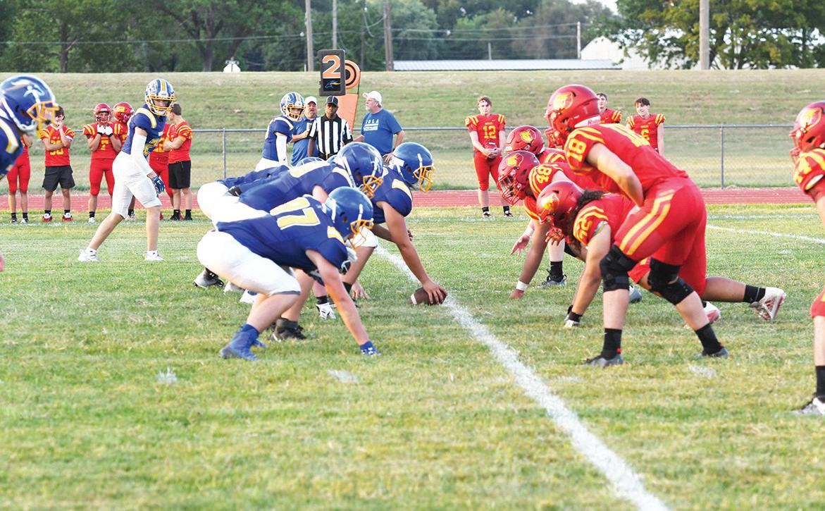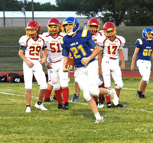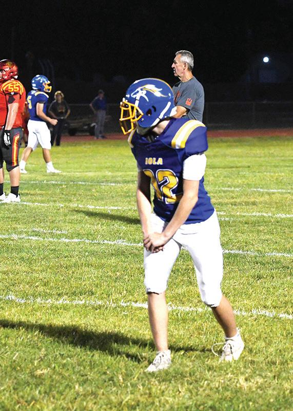 Iola High School’s Mustangs hosted their annual Jamboree Friday night at Riverside Park. Other schools in attendance included Labette County and Columbus. At top left, Mustangs line up on o ense against Labette County. At lower left, Iola’s Carter Hutton (4) celebrates a touchdown during the scrimmage. Below at middle, Konner Larney (32) lines up on o ense. At top right, Marmaton Valley’s Wildcats were in Rosalia for a jamboree hosted by Flinthills, where quarterback Brayden Lawson looks for an opportunity to throw the ball.