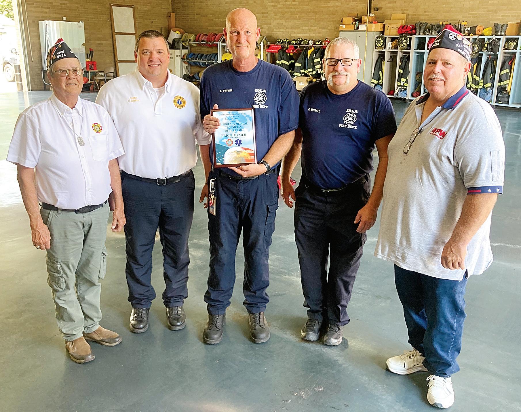 The Iola Register Members of LaHarpe’s Willis Ross Veterans of Foreign Wars Post 6324 present Lt. Eric B’Hymer of the Iola Fire Department with its Emergency Medical Technician of the Year Award Friday. Taking part in the ceremony are, from left, Terese Yetzbacher, VFW service officer, Iola Fire Chief Corey Isbell, B’Hymer, Deputy Fire Chief Gary Kimball and VFW Post Commander Doug Northcutt.