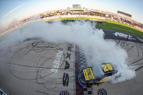 John Hunter Nemechek, driver of the #20 Romco Equipment Toyota, celebrates after winning the Andy’s Frozen Custard 300 at Texas Motor Speedway Saturday. (J. Bachman/Getty)